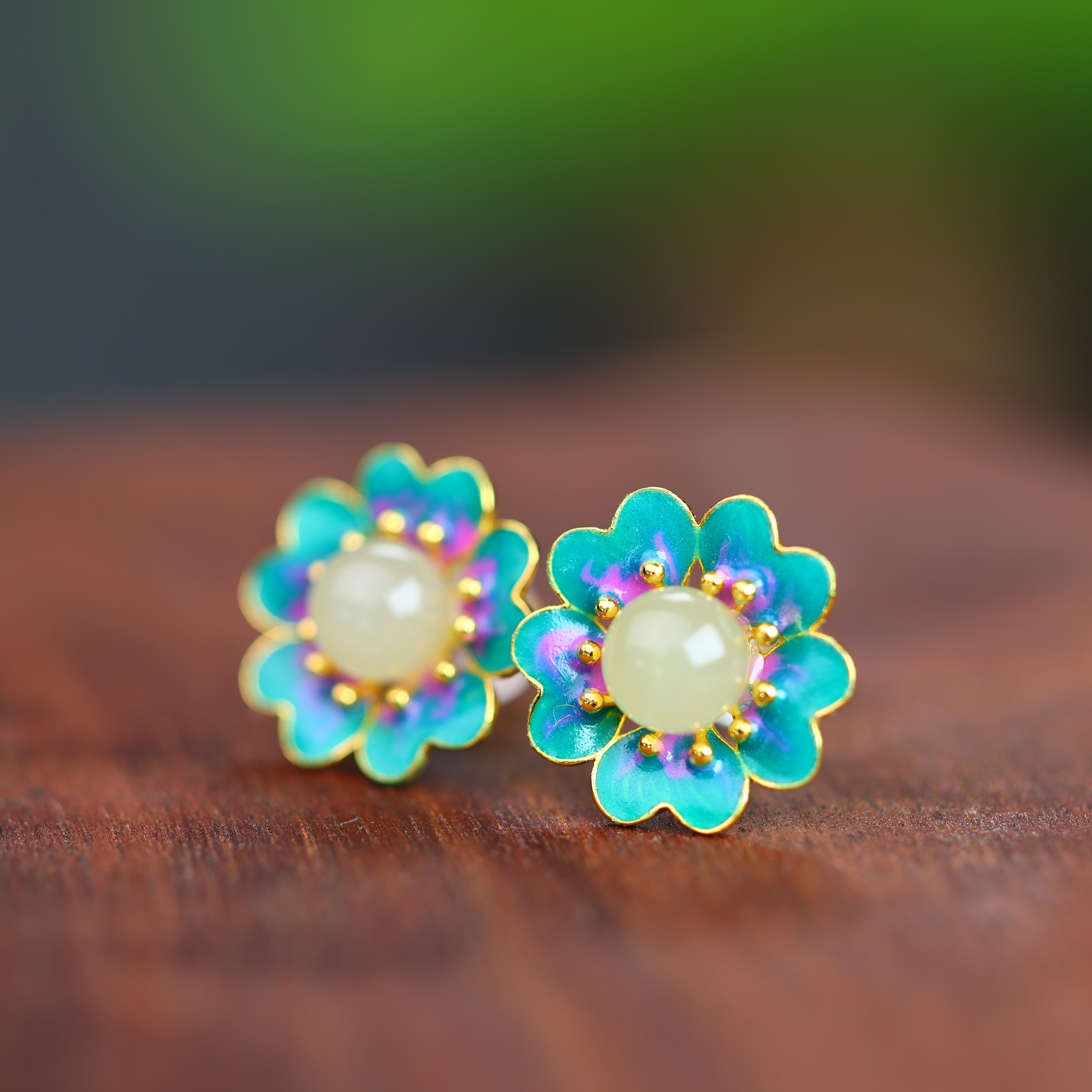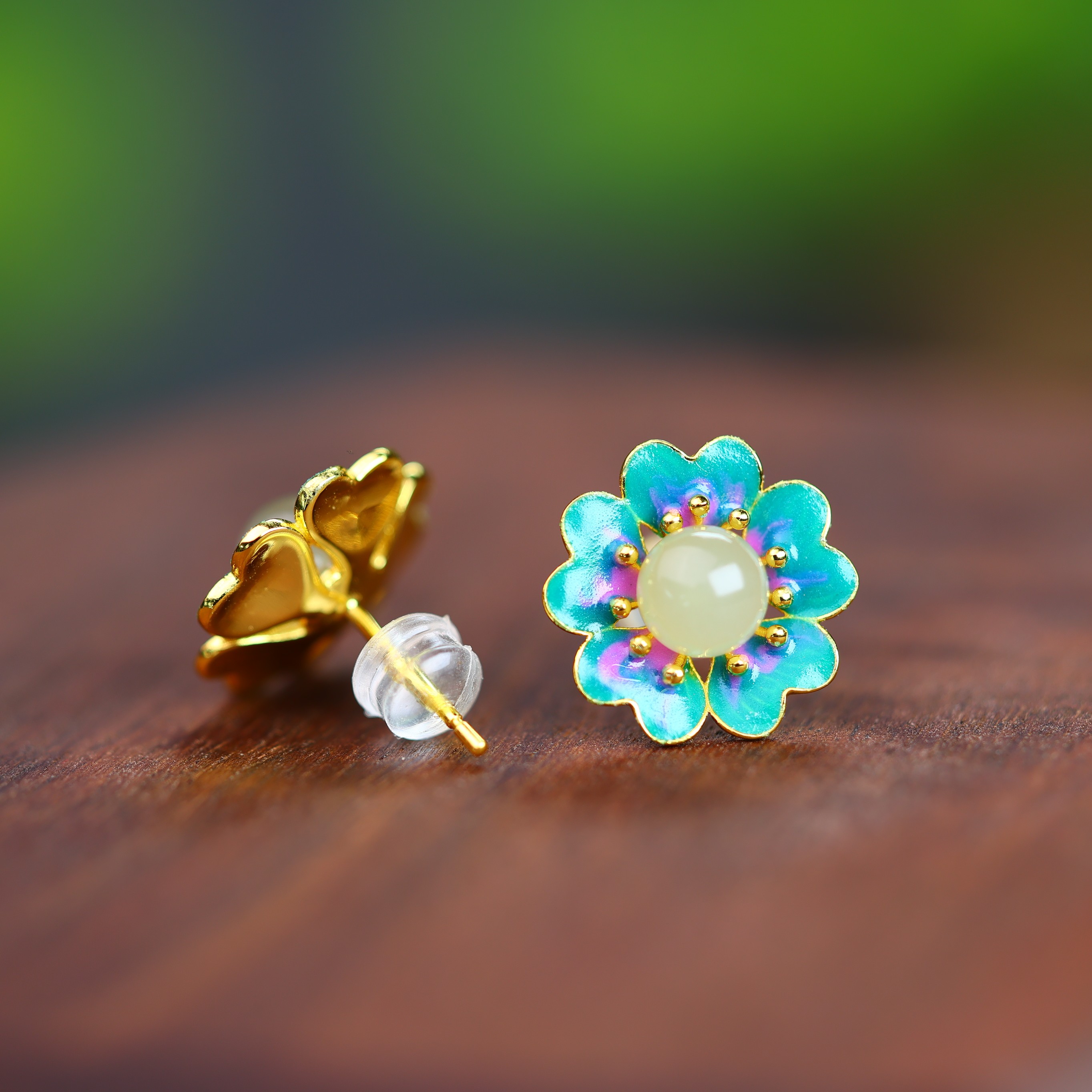 天然和田玉青白玉花朵珐琅樱花925银镶嵌耳钉耳环玉石耳石