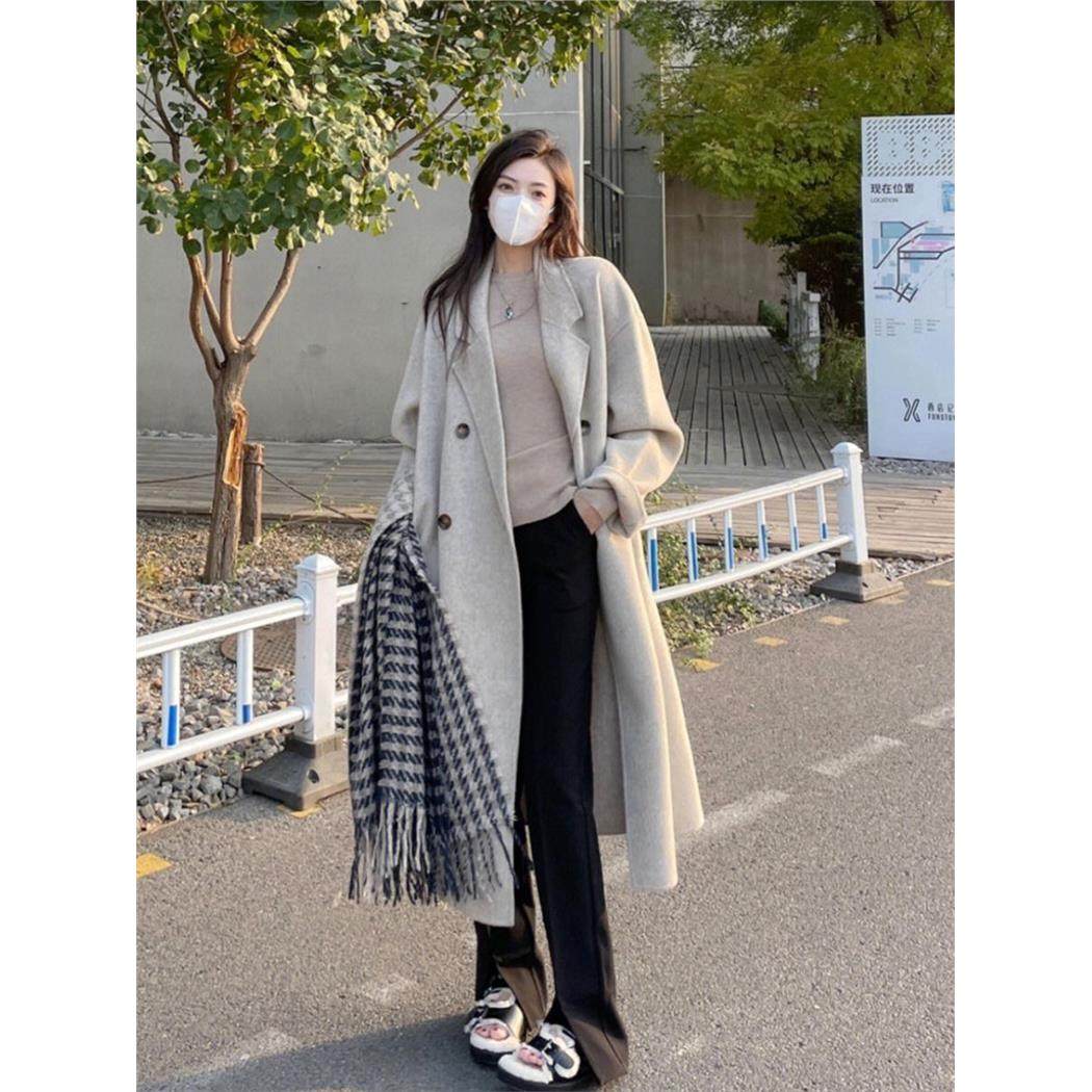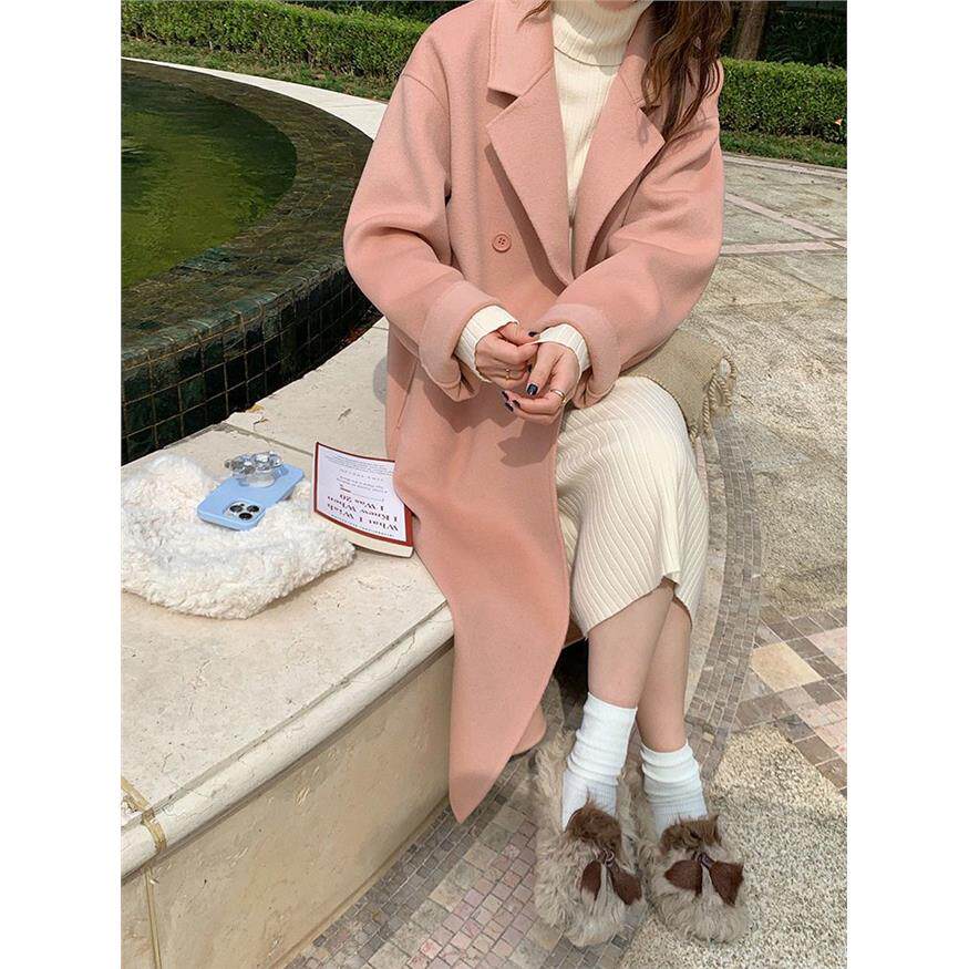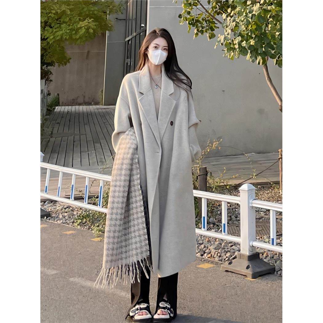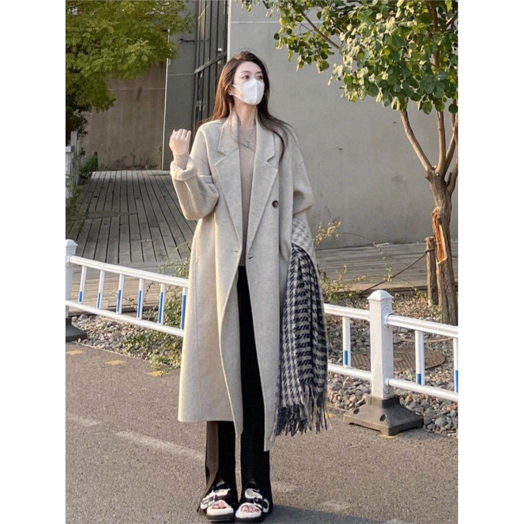 反季燕麦色双面绒大衣女2025秋冬新款韩版宽松中长款过膝毛呢外套