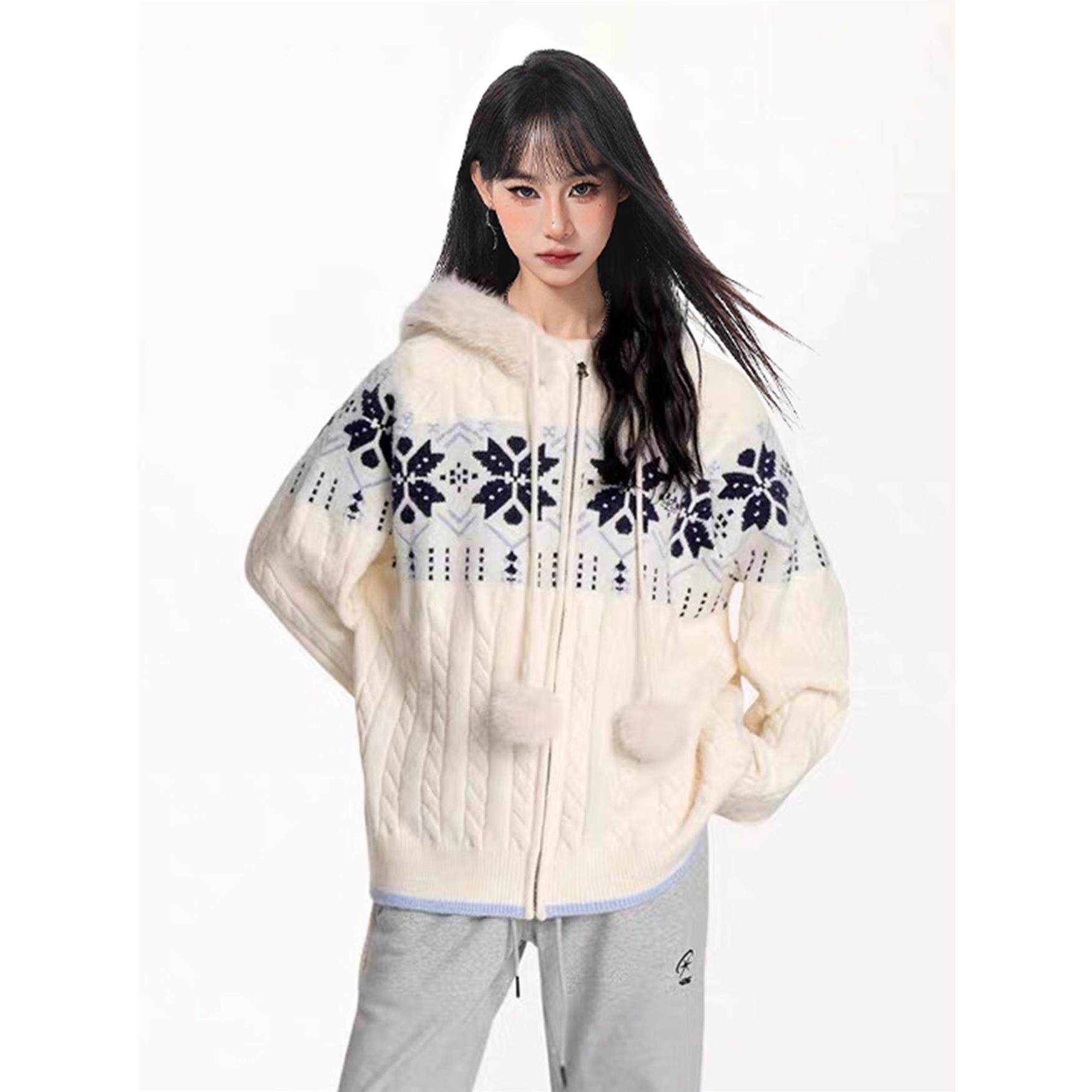 费尔岛麻花连帽毛衣外套女秋冬季2025新款慵懒风加厚提花针织开衫