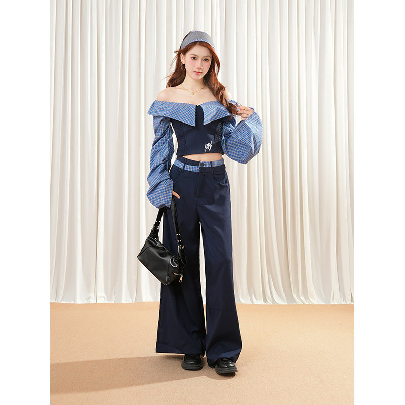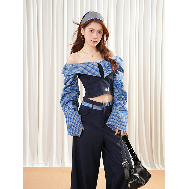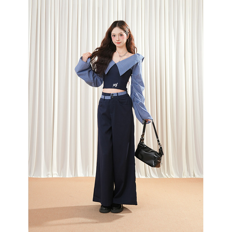 美式辣妹设计拼接条纹长袖衬衫夏季新款显瘦高级感穿搭长裤两件套