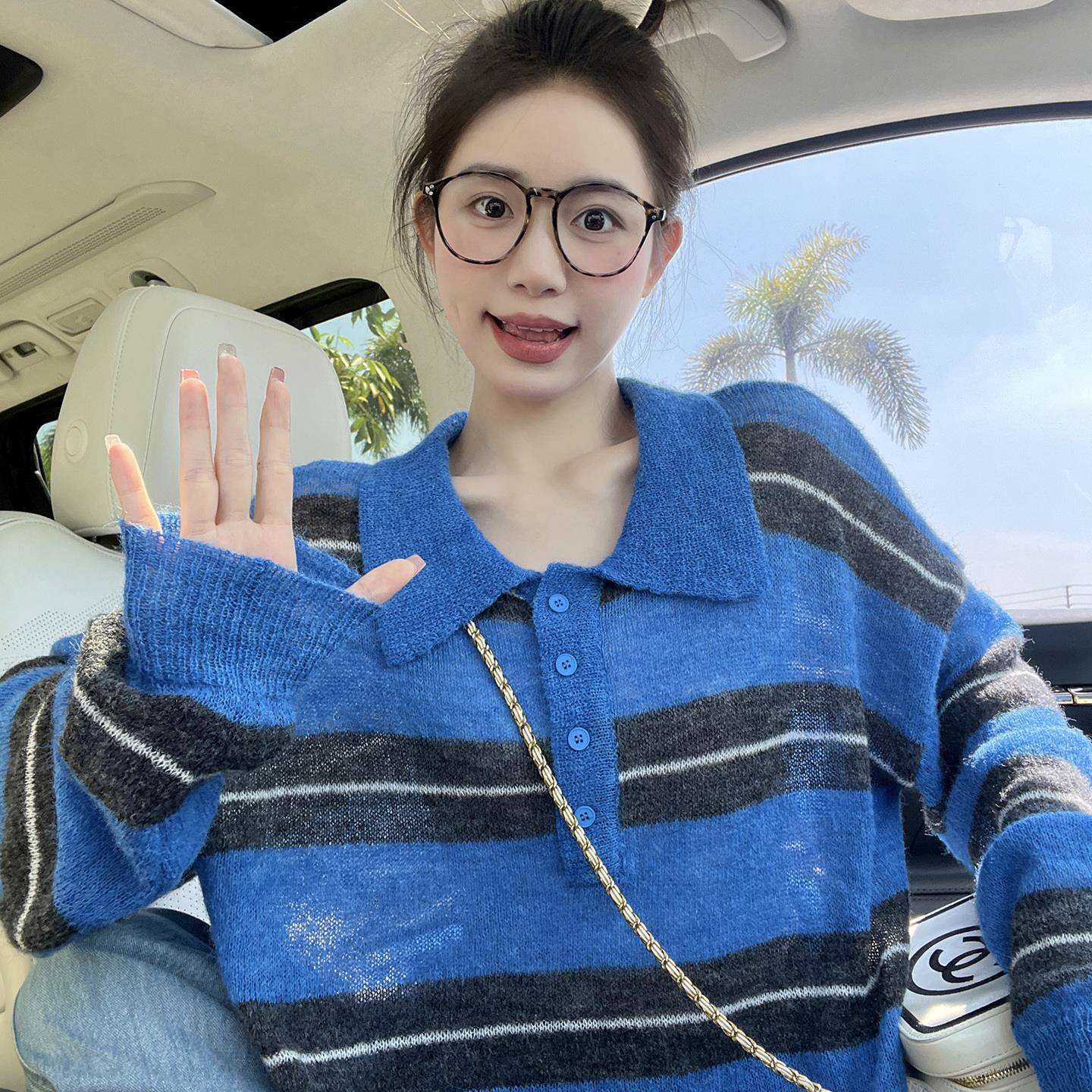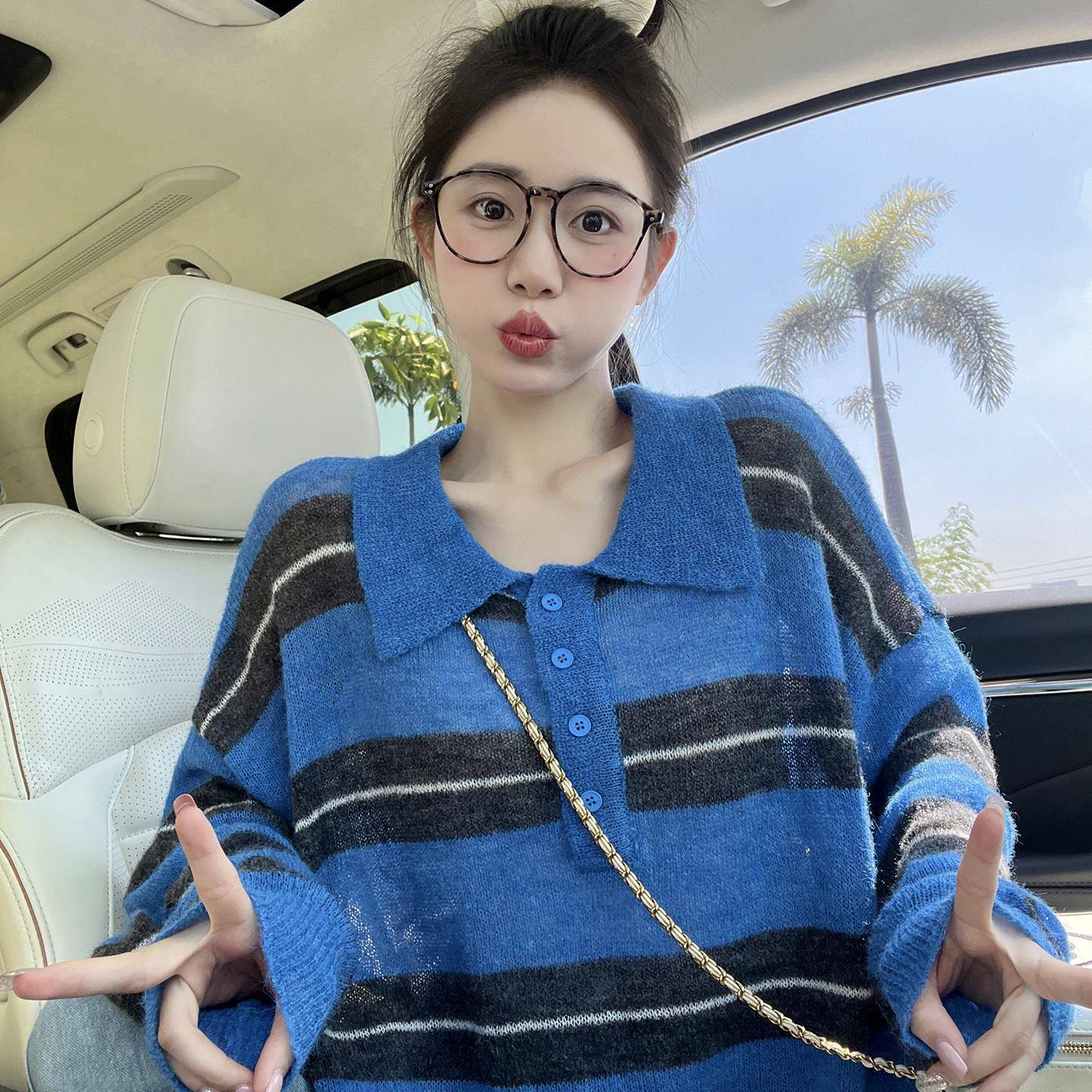 日系慵懒风蓝黑条纹POLO领针织衫女装2025秋季百搭宽松软糯糯毛衣