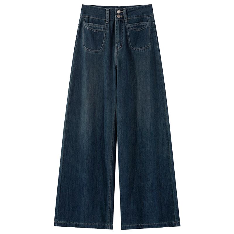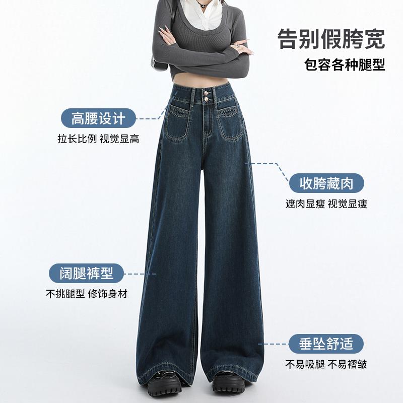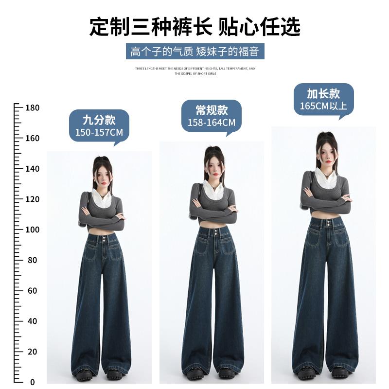 深蓝色阔腿牛仔裤2025年新款女春季小个子高腰宽松秋冬加绒直筒裤