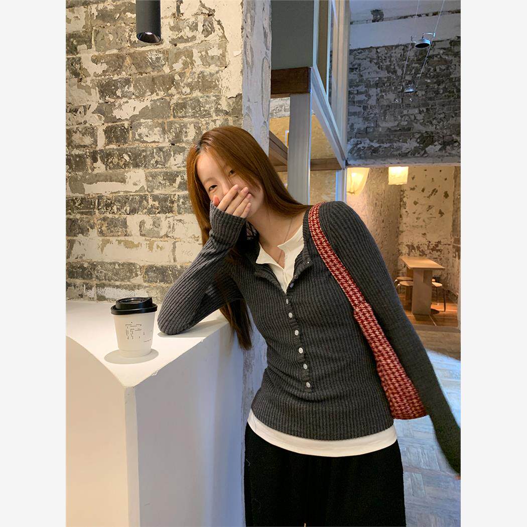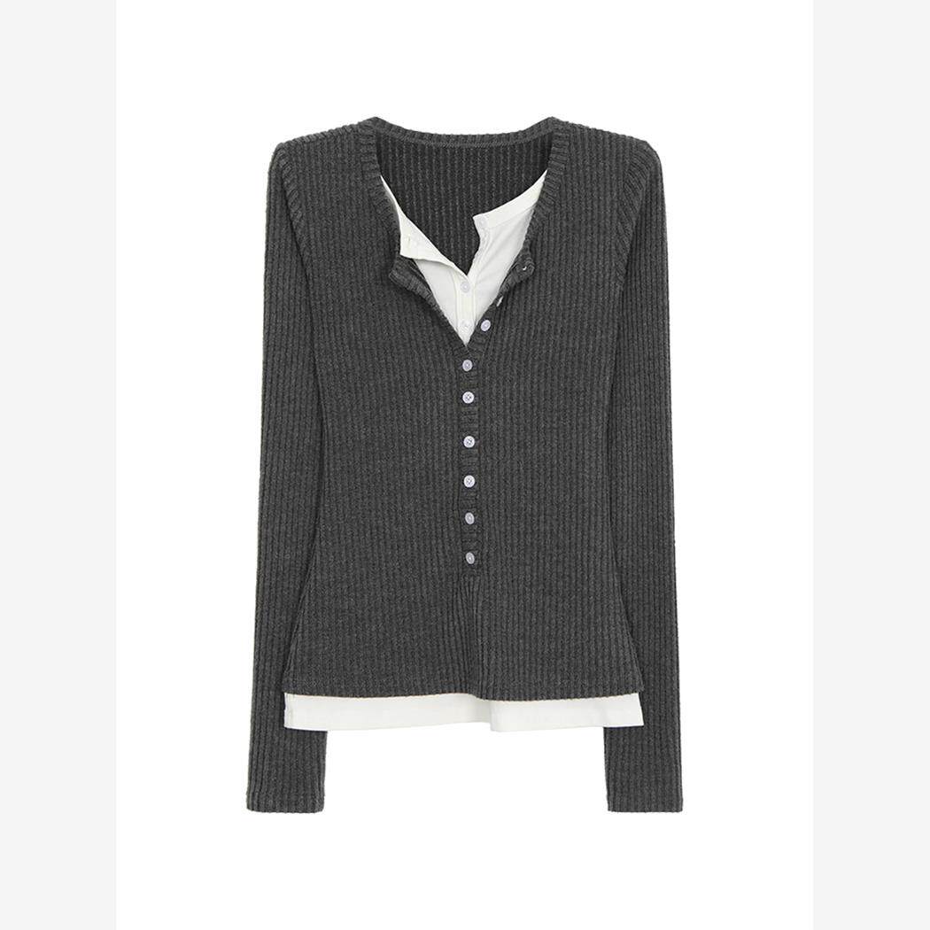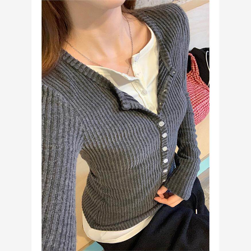 超好看毛衣女秋季2025新款今年流行的假两件上衣灰色针织衫