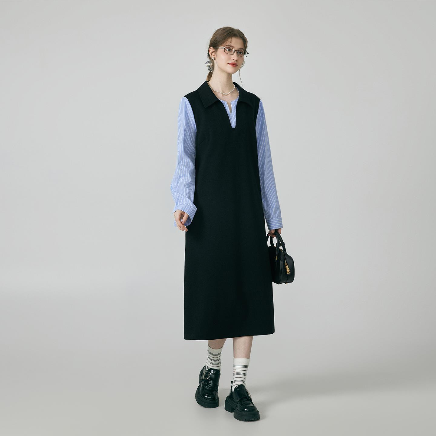 裂渡微胖大码女装【情话】轻熟简约衬衫拼接翻领假两件卫衣连衣裙
