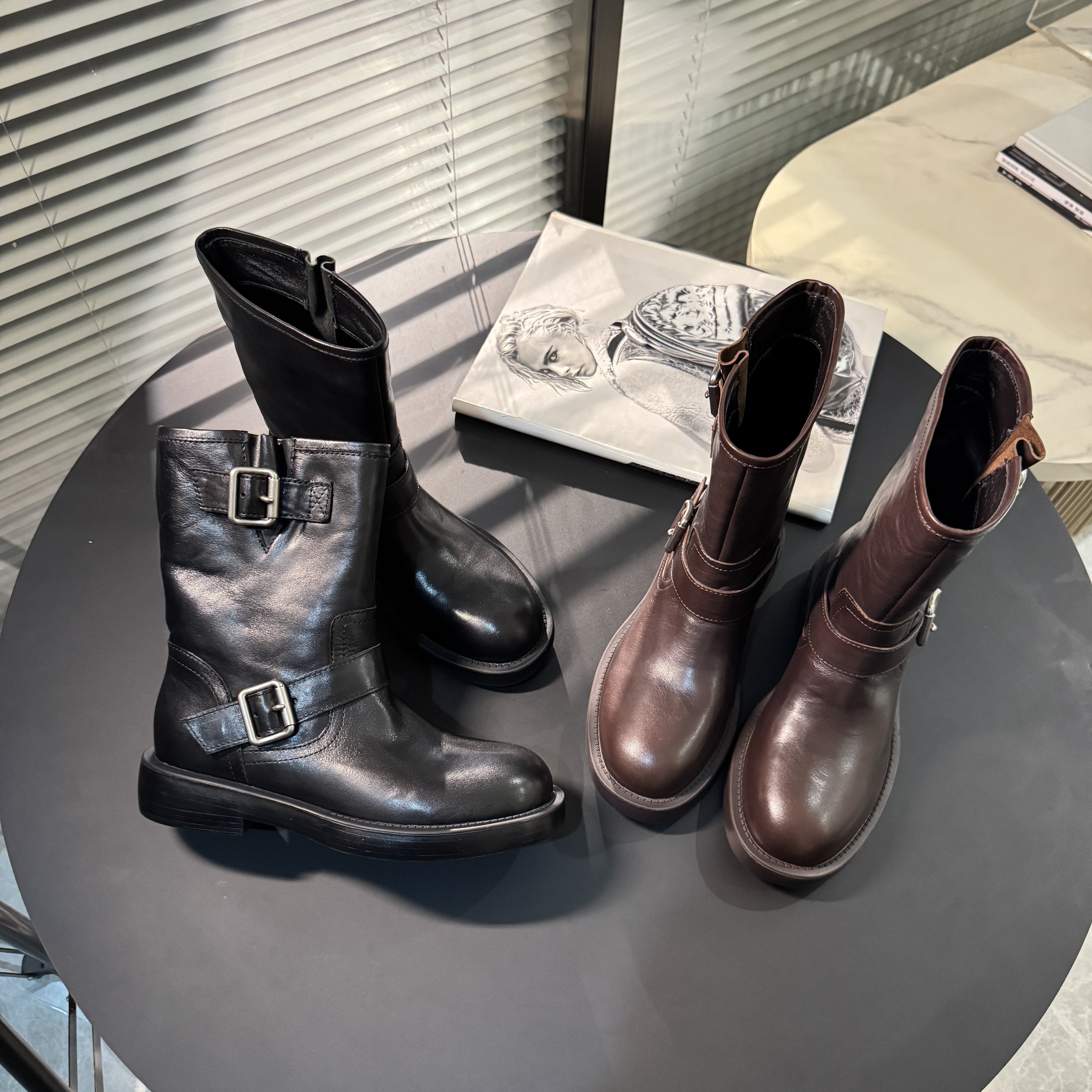 【老罗道歉场】EM2025秋冬新款双皮带扣中筒牛皮短靴