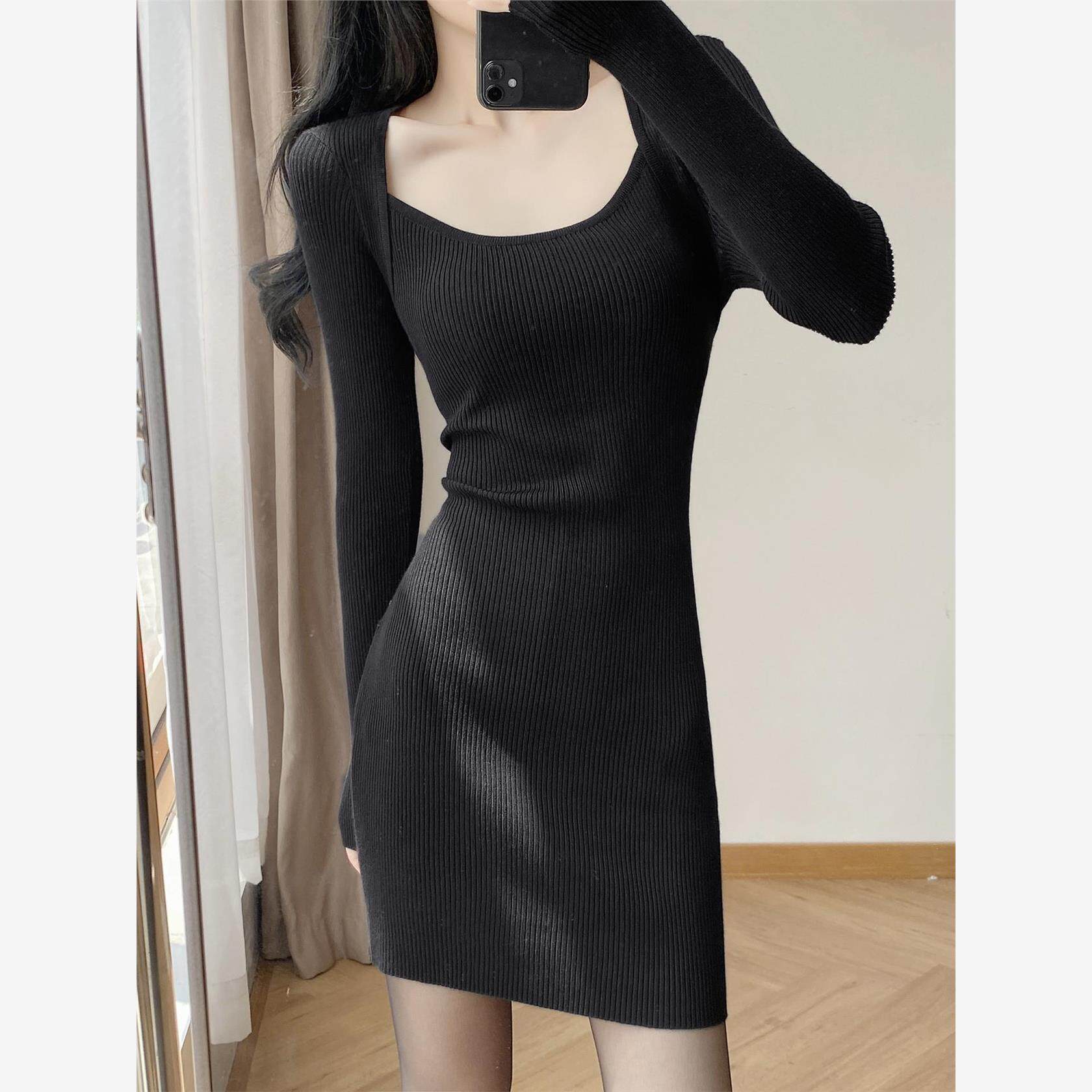 针织连衣裙女秋冬内搭纯欲修身收腰辣妹包臀裙方领打底毛衣短裙子