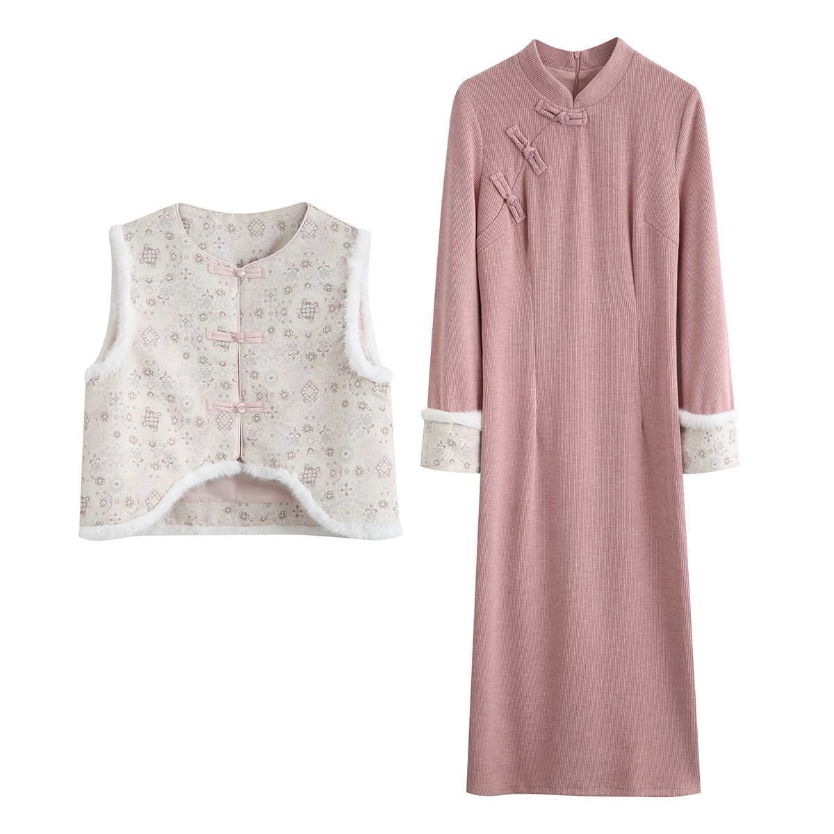 2025秋冬季新款气质新中式国小清新风旗袍仿宋锦马甲连衣裙两件套