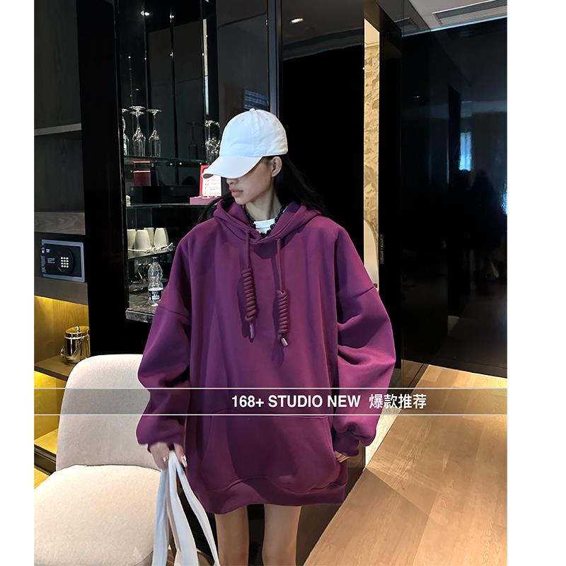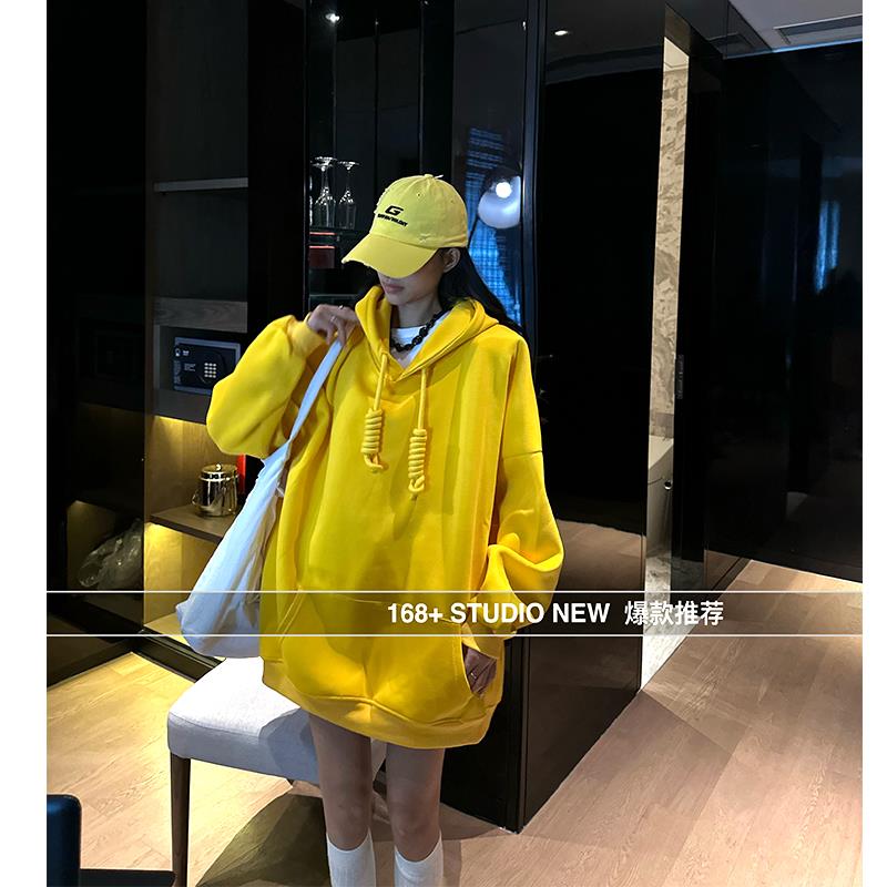 牛油果绿色卫衣女连帽大码加绒纯色粗绳大帽衫长款遮屁股下衣失踪