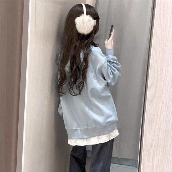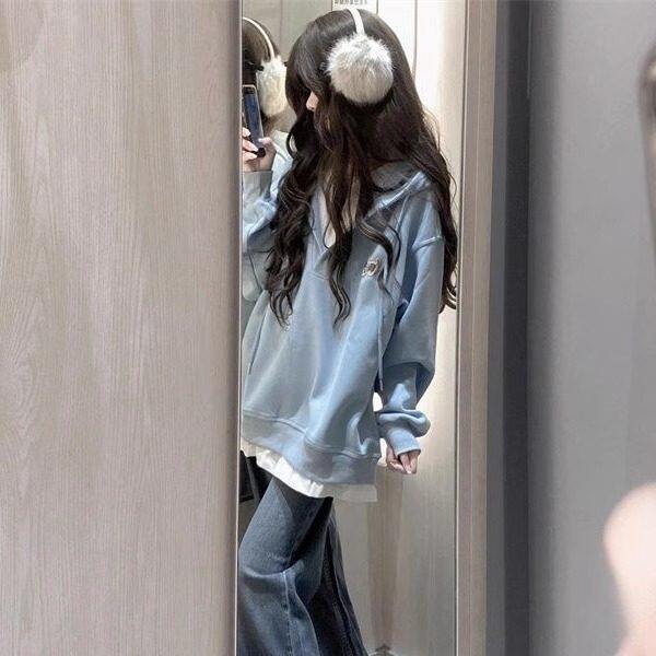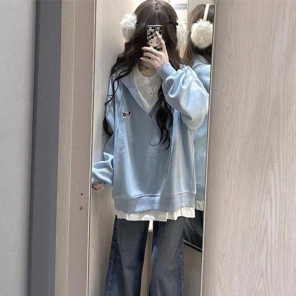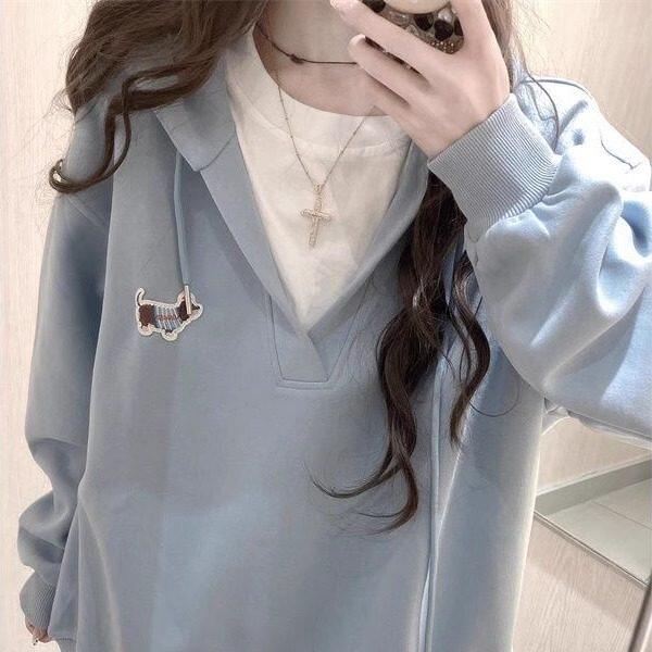 浅蓝色小狗刺绣假两件连帽运动衫女秋季宽松慵懒风设计感小众上衣