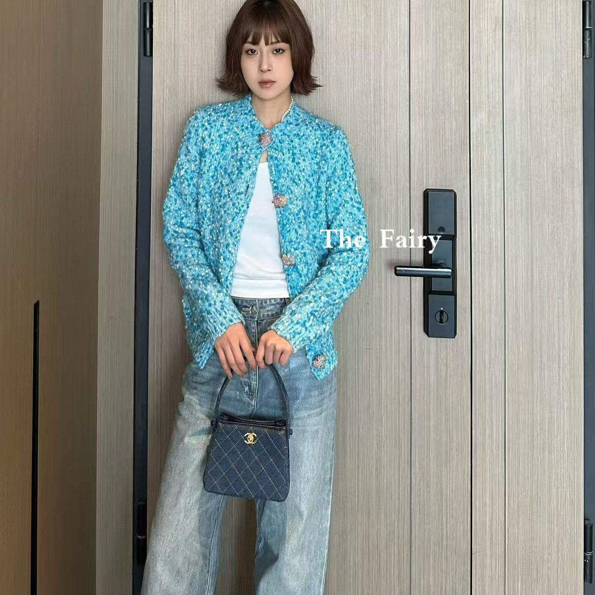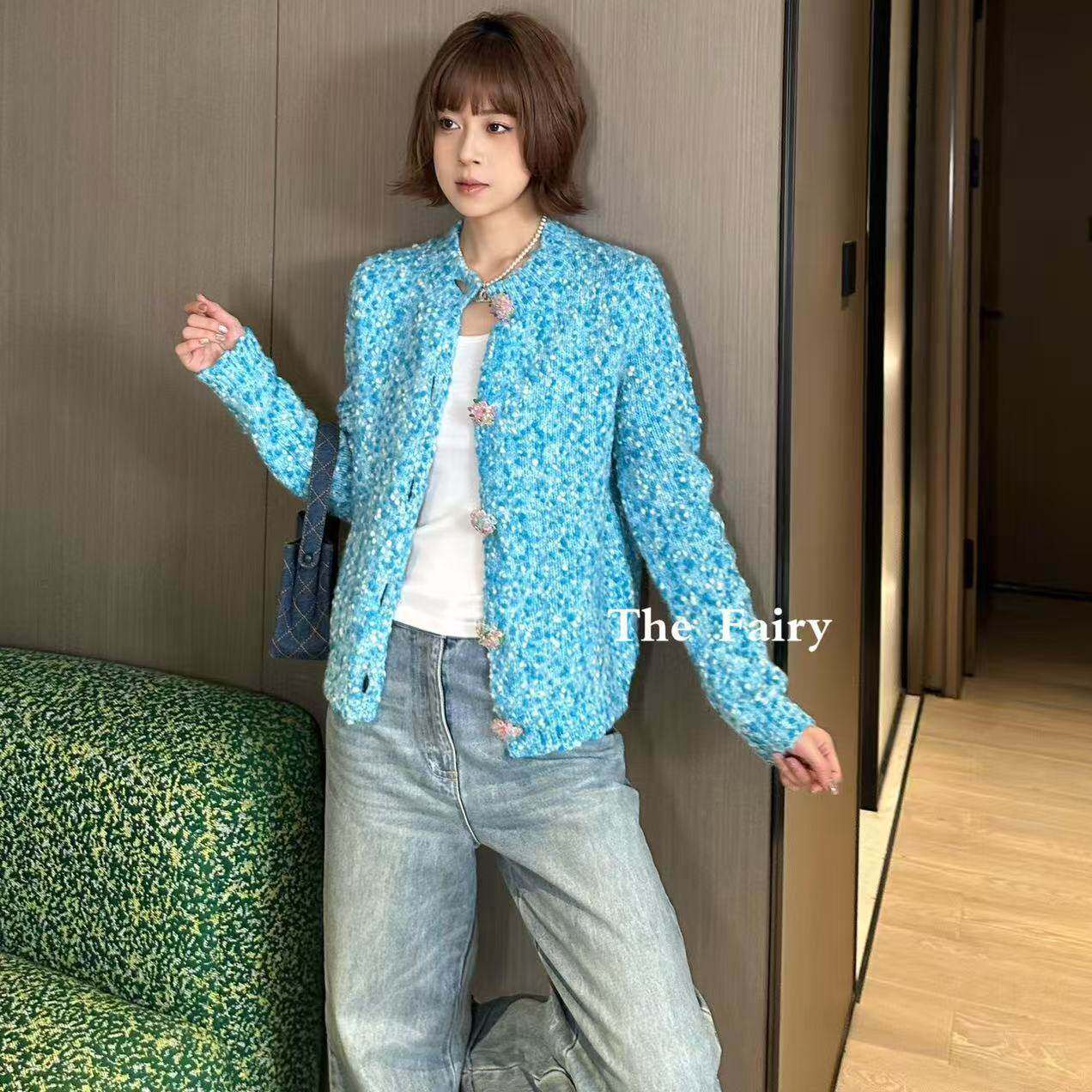 好漂亮天蓝色重工扣子小香风外套女2025年冬季新款毛衣宽松休闲潮