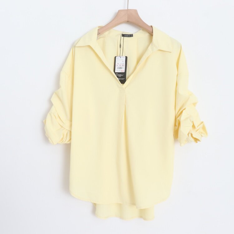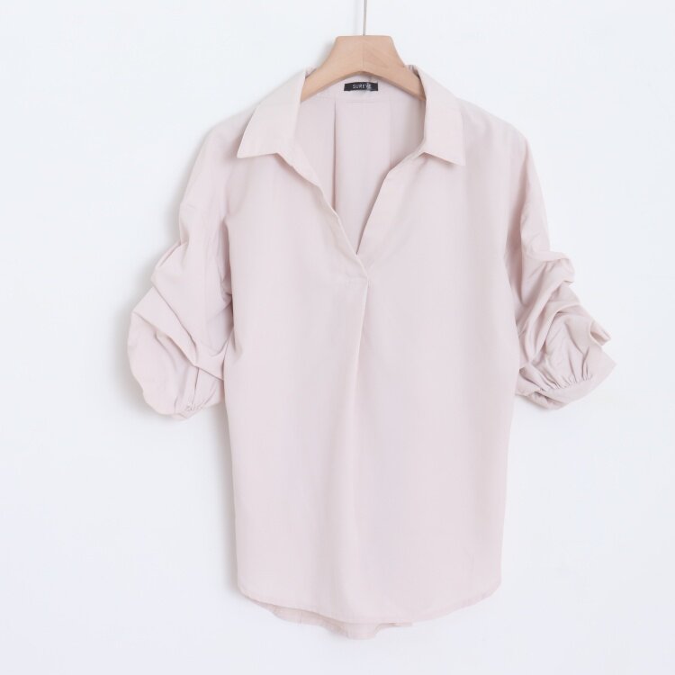 D15008日单客供料简洁V领套头宽松显瘦女纯色气质通勤堆堆袖衬衫
