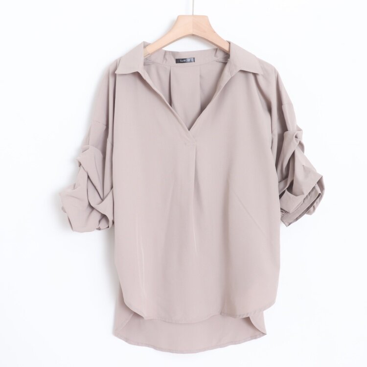 首页> 女装> D15008日单客供料简洁V领套头宽松显瘦女纯色气质通勤堆堆袖衬衫