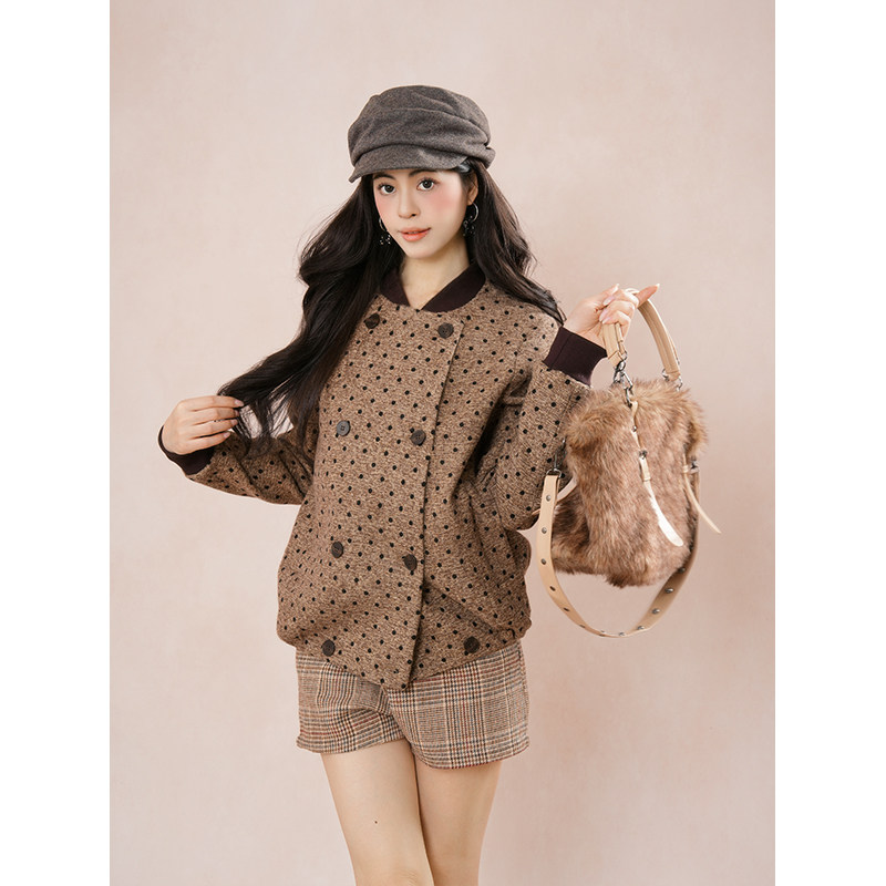 【板栗可可】日系复古套装女秋冬新款波点宽松外套格纹短裤两件套