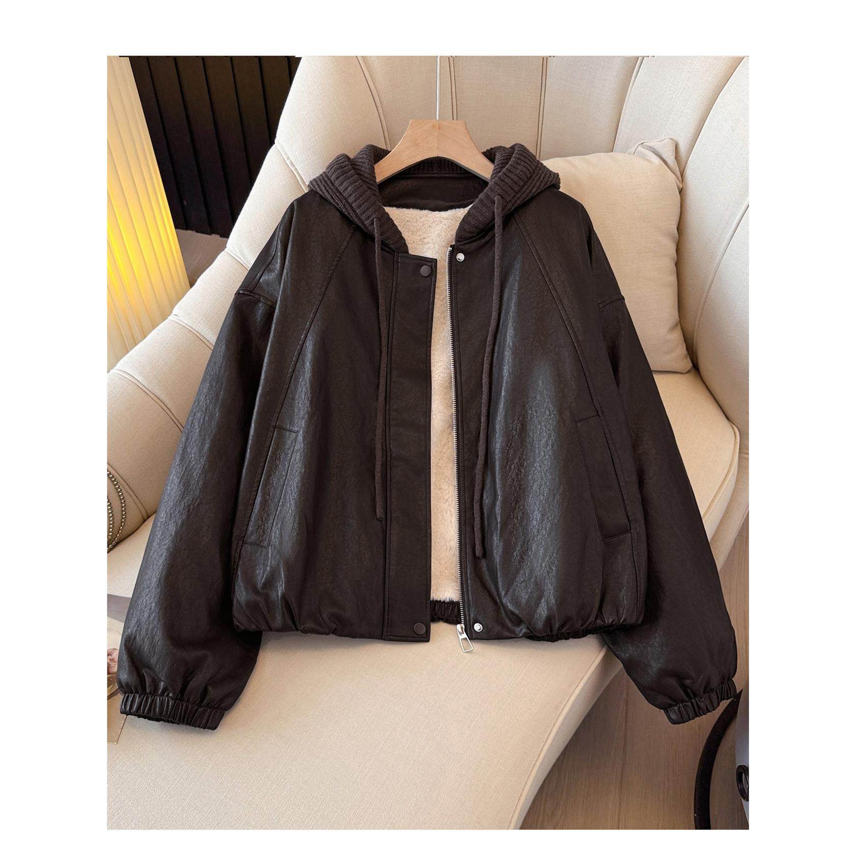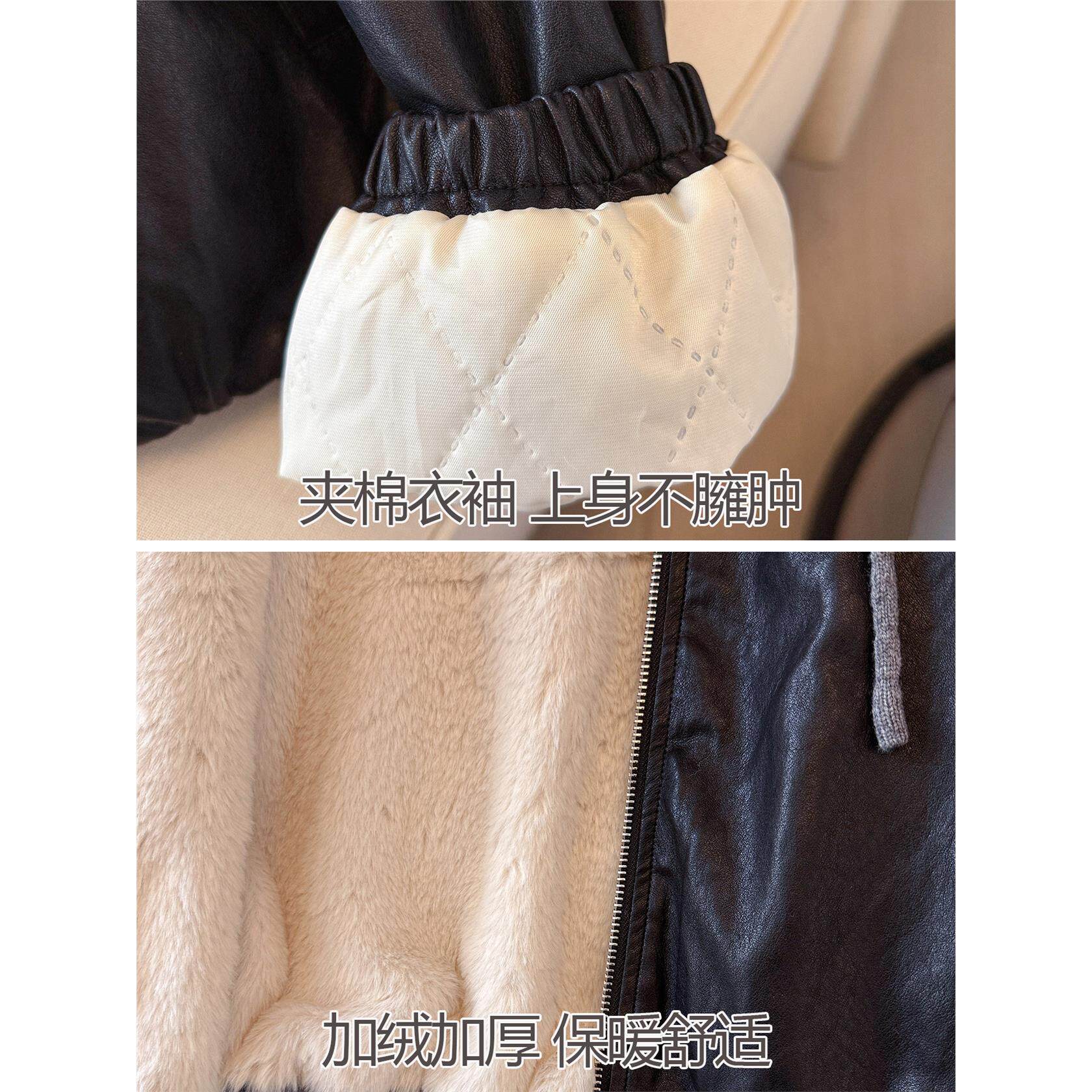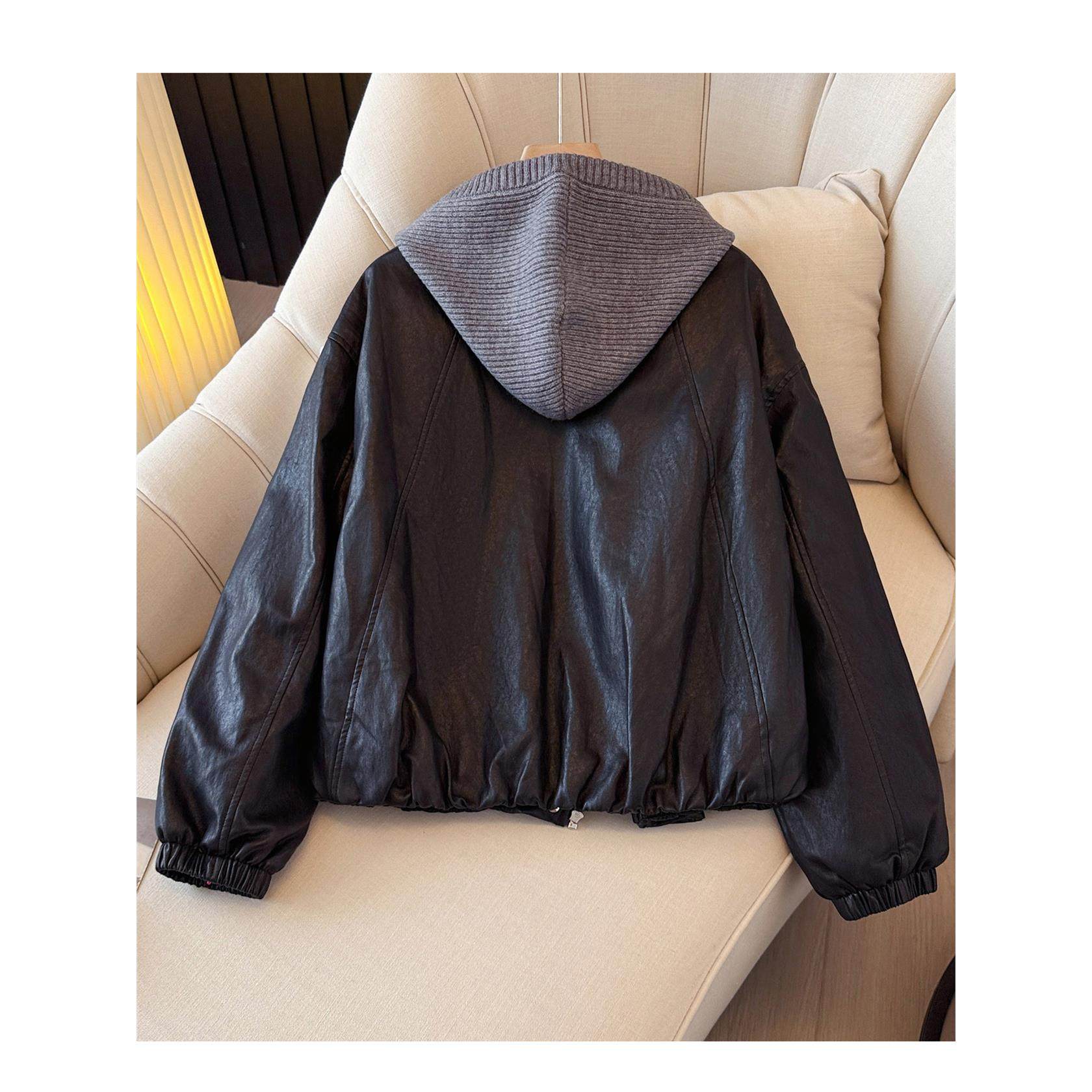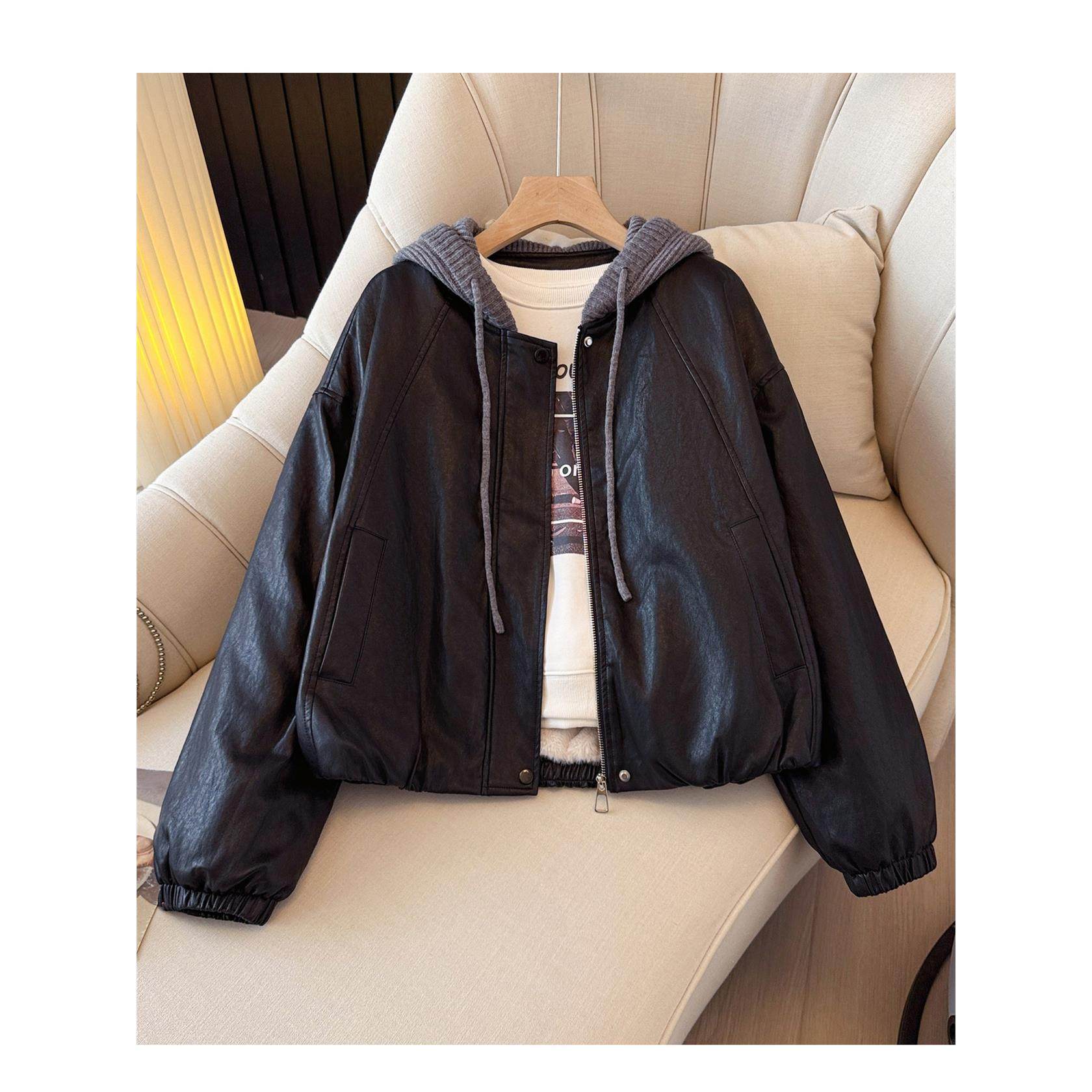 黑色连帽拼接pu皮衣加绒加厚外套女2025冬装新款今年流行爆款夹克