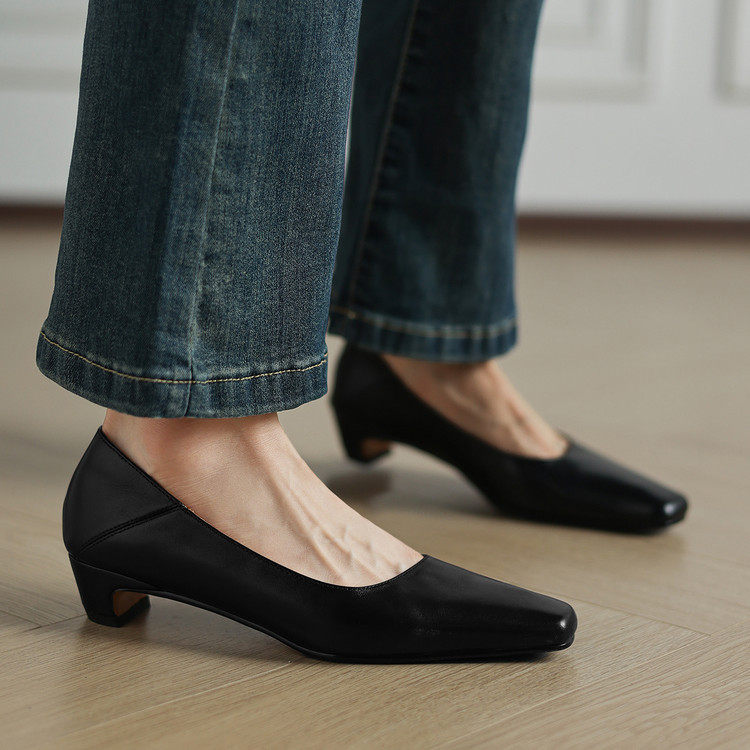 头层牛皮职业女款粗跟浅口新款四季工作法式尖头33码单鞋女款