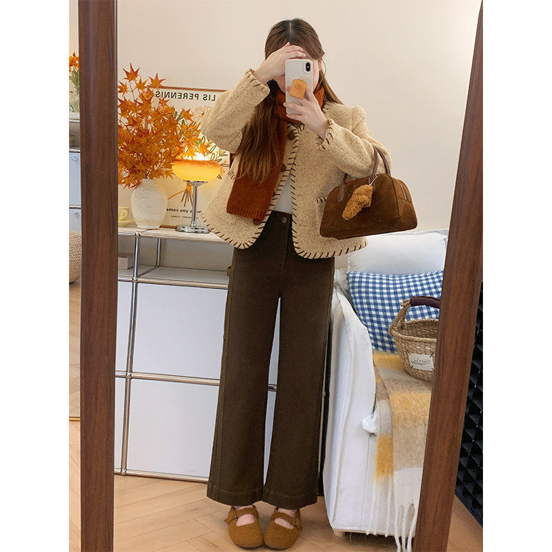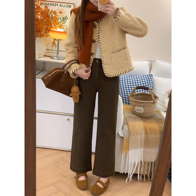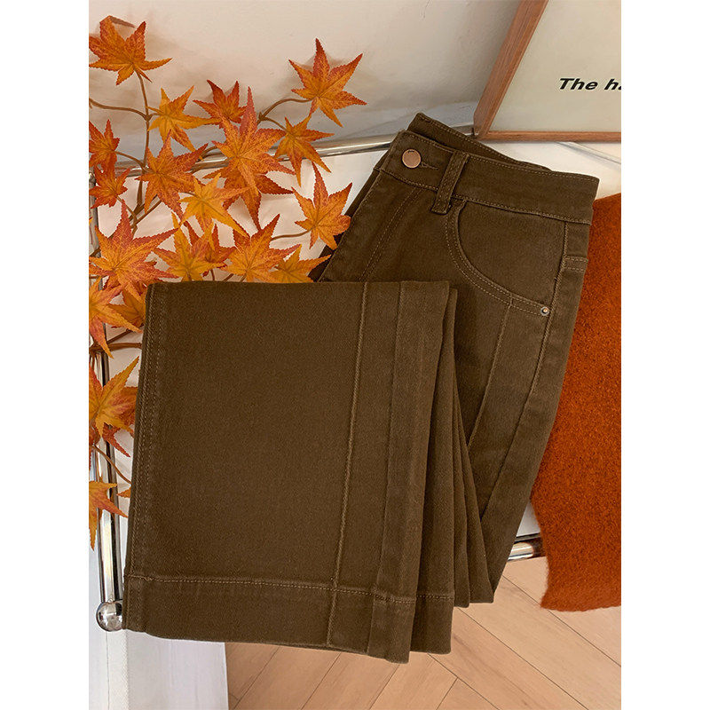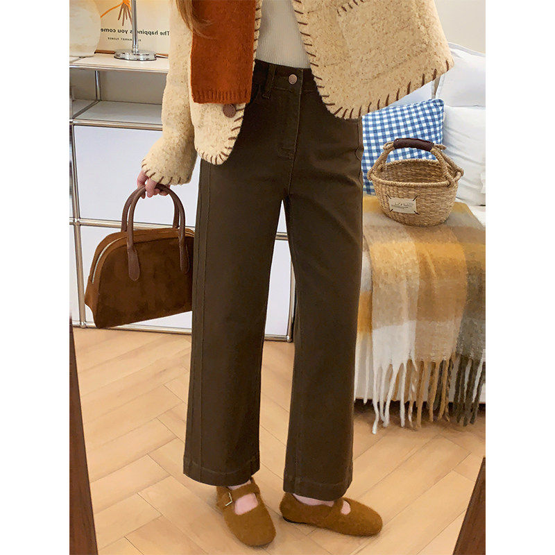冬季美拉德棕咖色牛仔裤女加绒梨型身材小个子高腰显瘦直筒宽裤