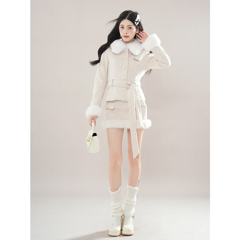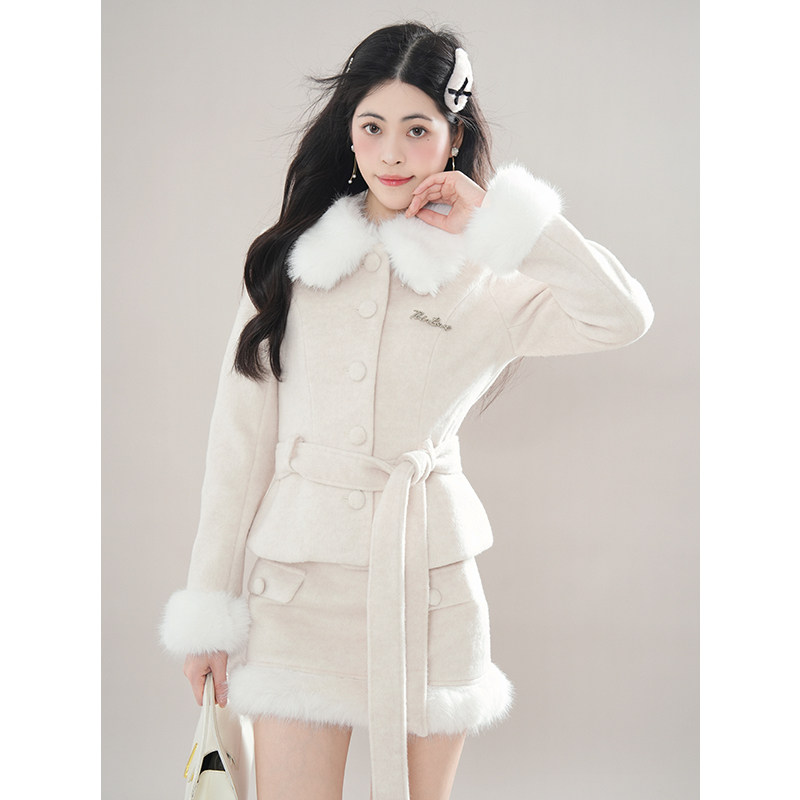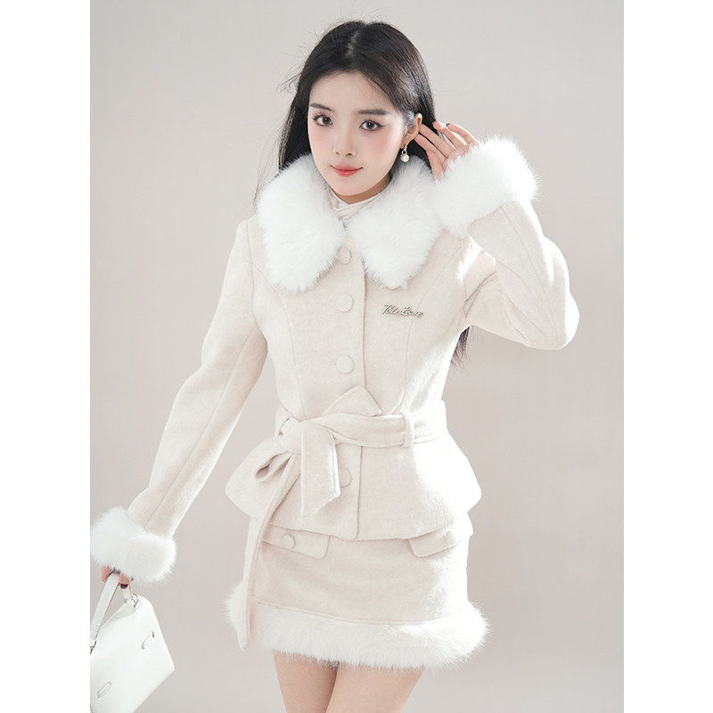 财阀千金感 米色小香风毛领重工收腰毛呢外套+包臀裙套装女冬新款
