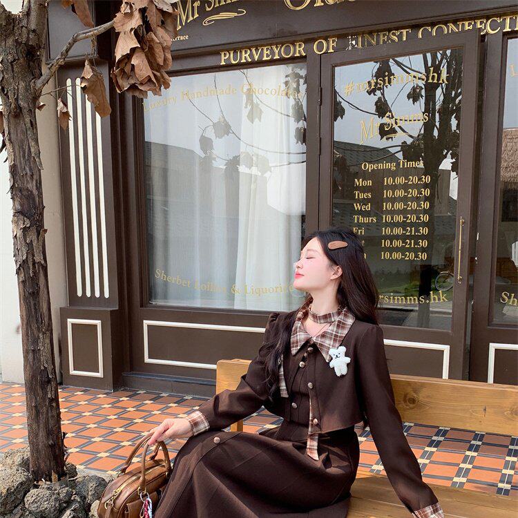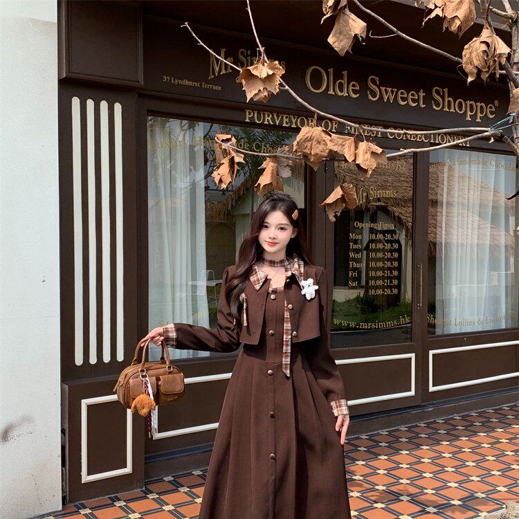 实拍 大码胖mm法式复古女秋格子西装外套连衣裙两件套