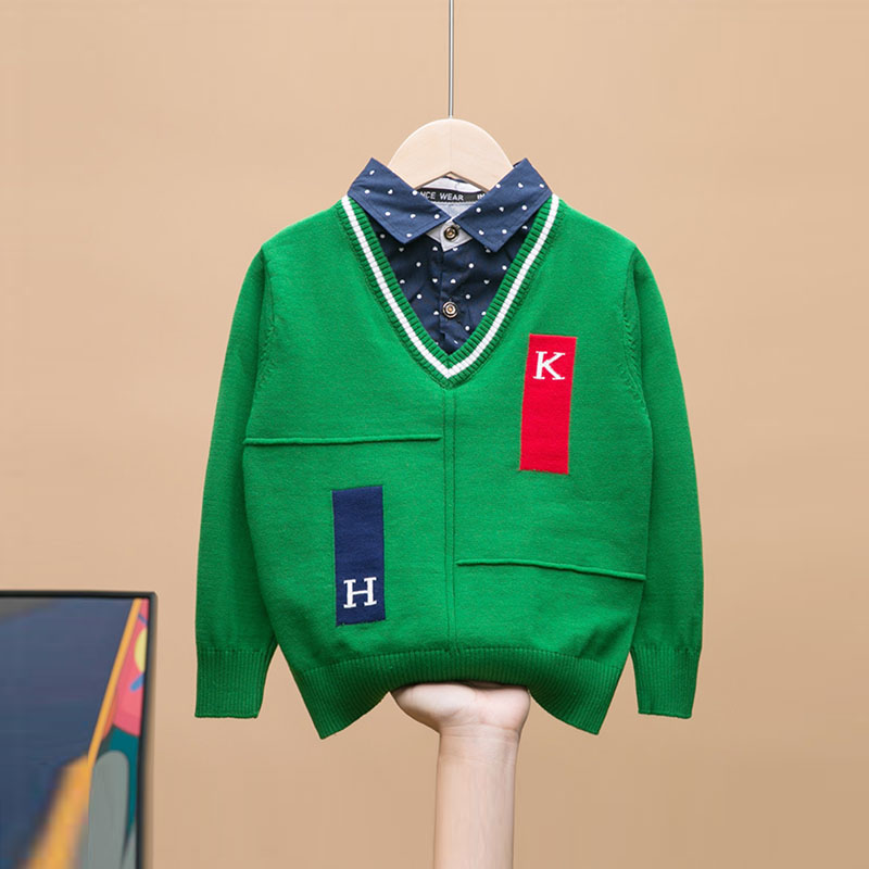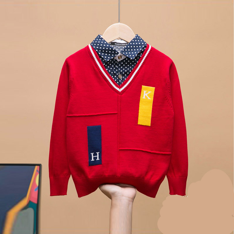假两件套全棉纯棉中小童男童春秋冬童装套头毛衣薄款衬衫领外套