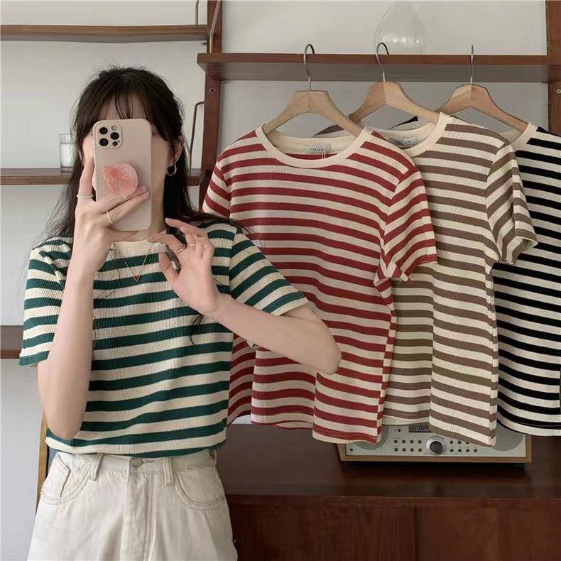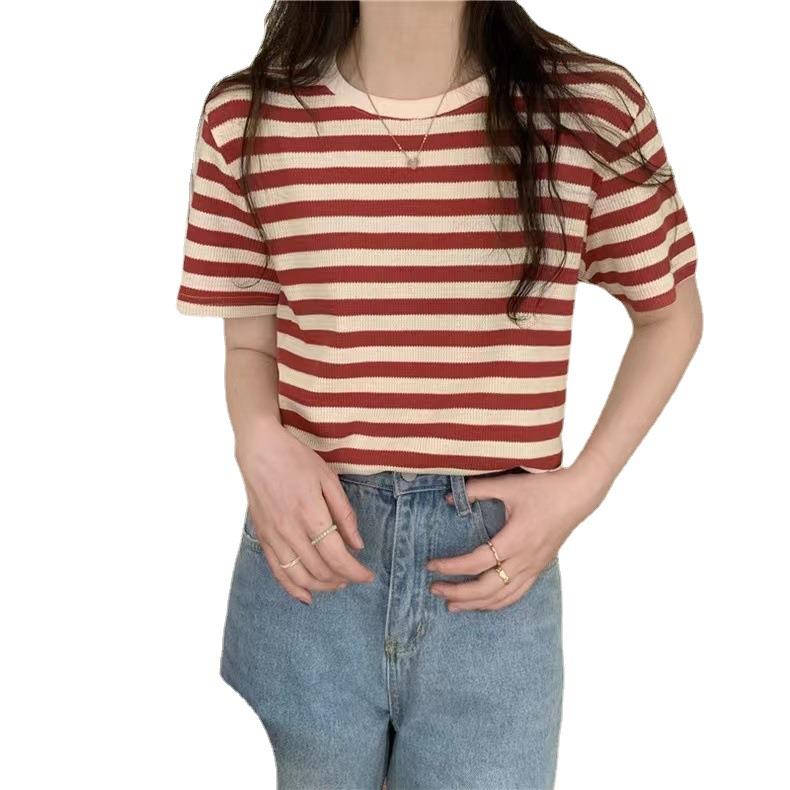 圆领条纹短袖针织衫女夏季新款薄款显瘦修身甜美可爱上衣女小衫潮