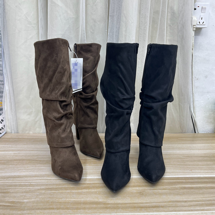 外贸原单女靴新款尖头纯色粗高跟绒面长筒靴裤裙靴时尚堆堆靴