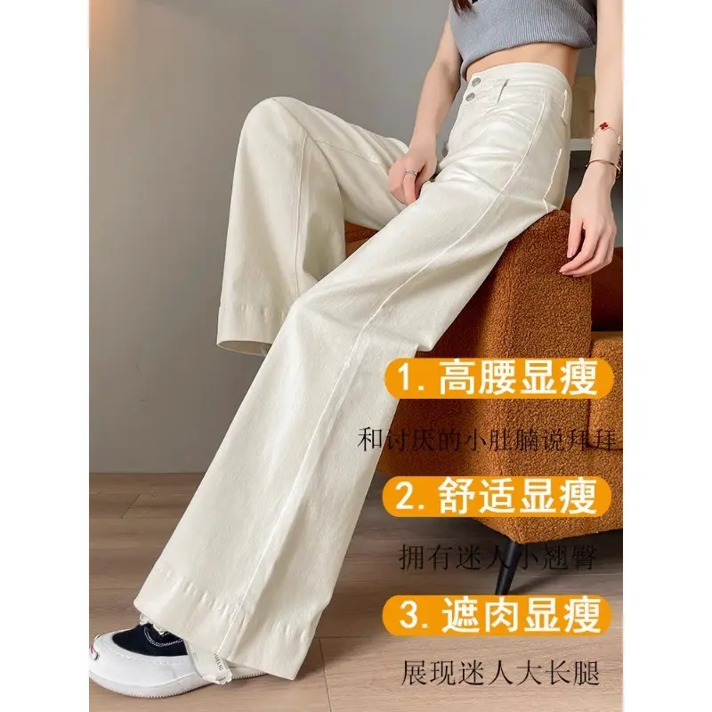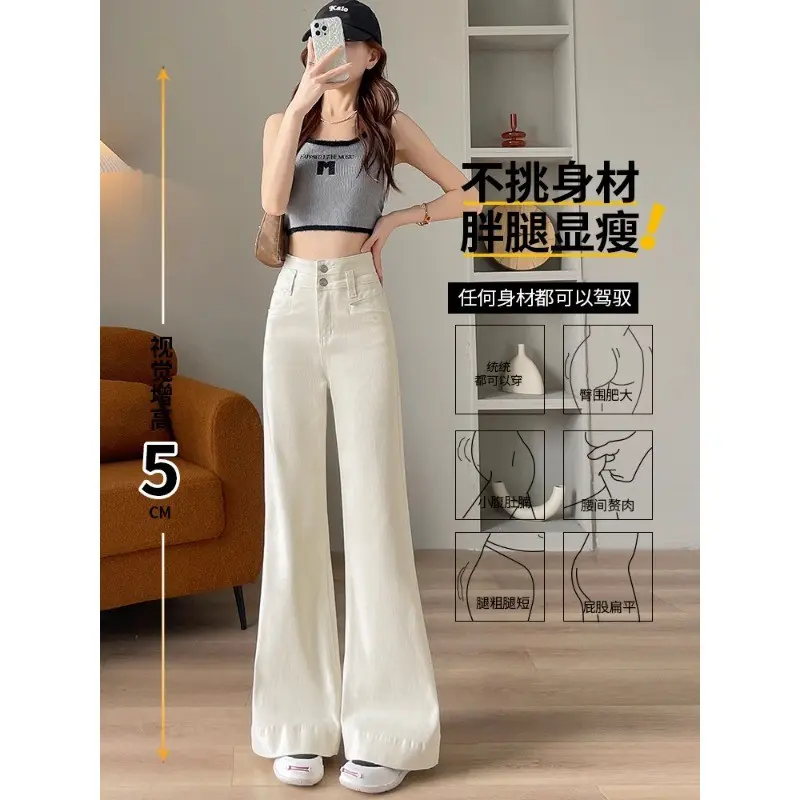 米白色阔腿牛仔裤女潮流百搭新款高腰显瘦遮肚修身设计感微喇长裤