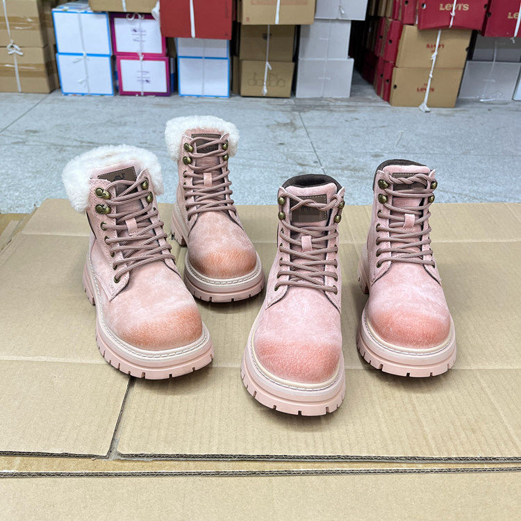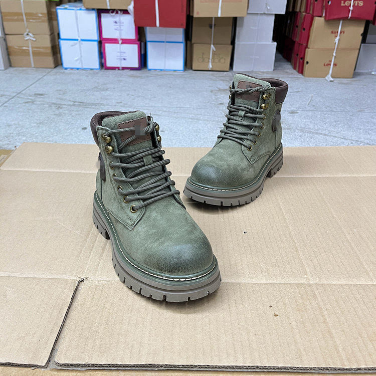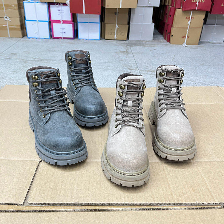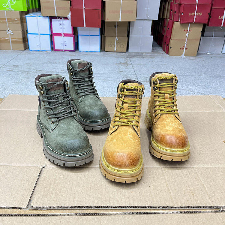 外贸原单女鞋真皮新款圆头纯色厚底系带粗跟短靴大黄靴户外登山靴