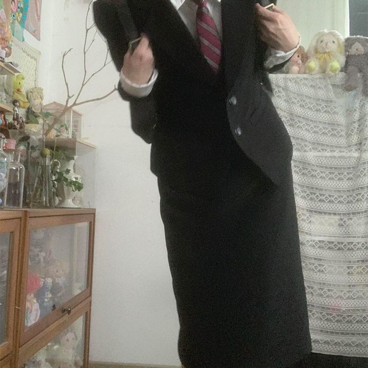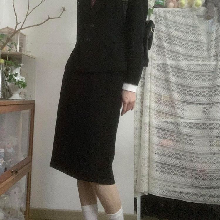 昭和少女 日系学院风显瘦套装女秋季新款黑色西装外套+半裙两件套