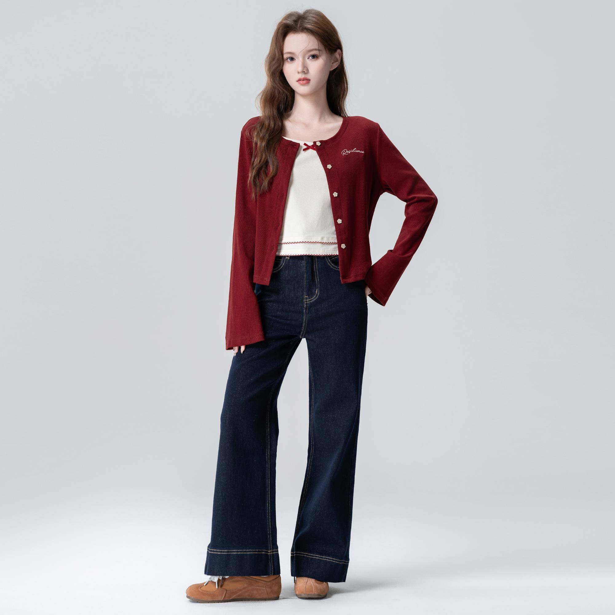 红色圆领针织开衫女春秋2025秋季新款刺绣设计感薄款外套短款上衣