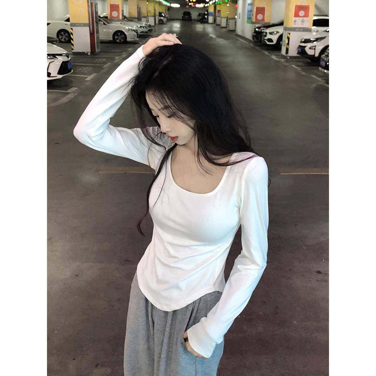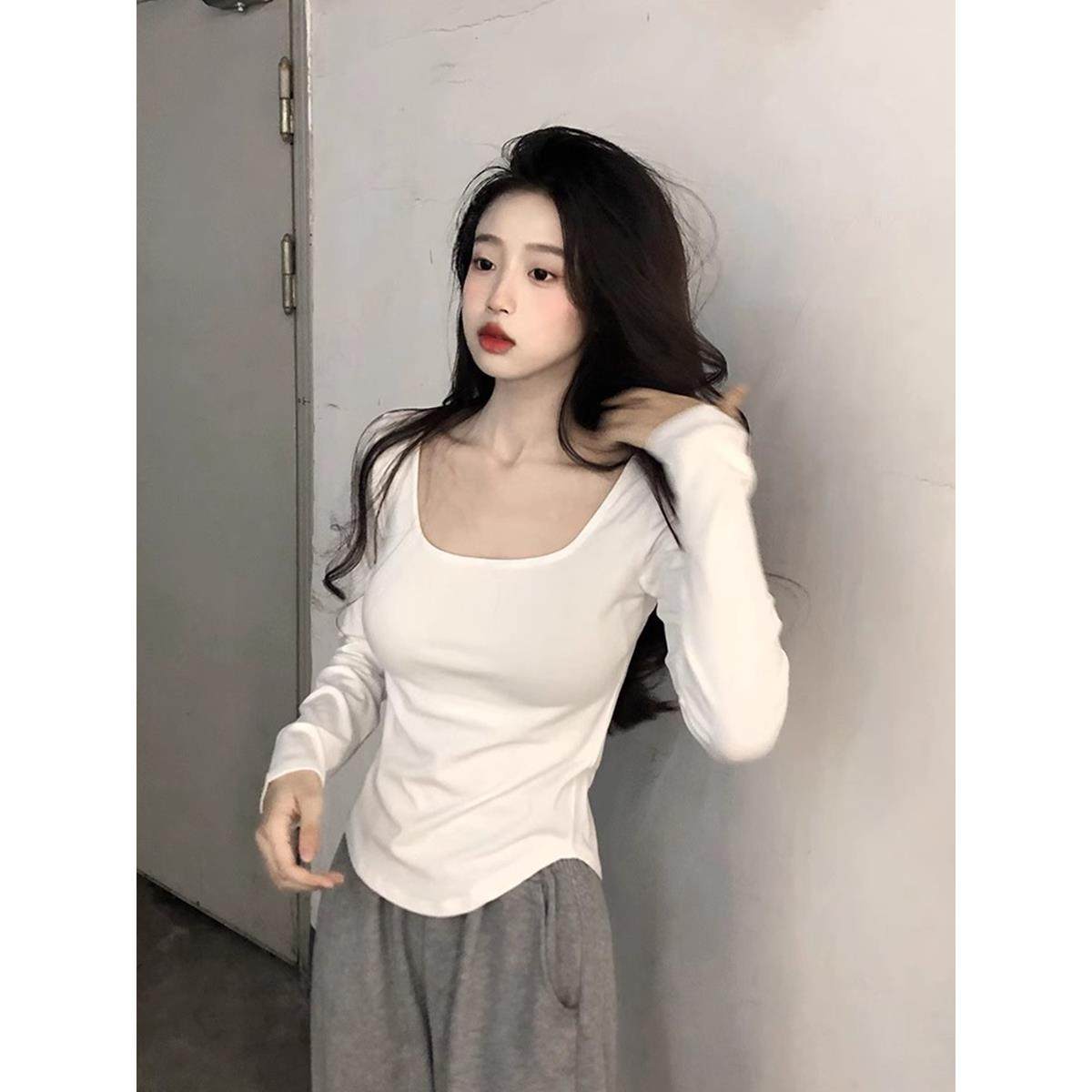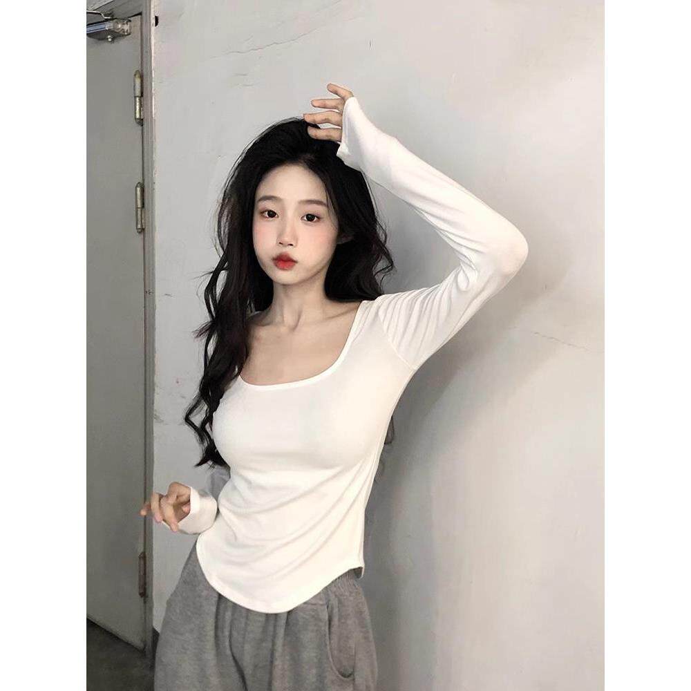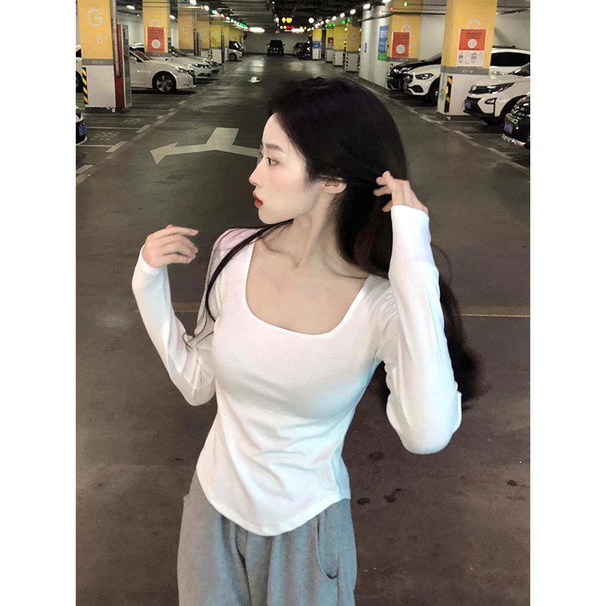 2025夏装新款正肩方领长袖t恤女装独特漂亮超好看打底衫内搭上衣