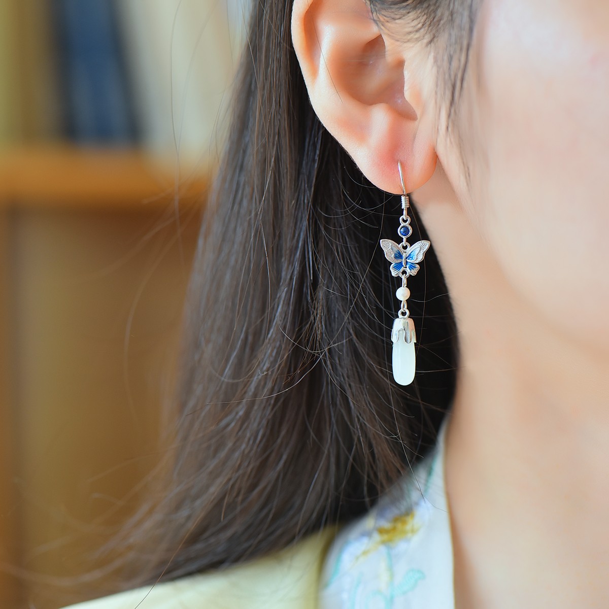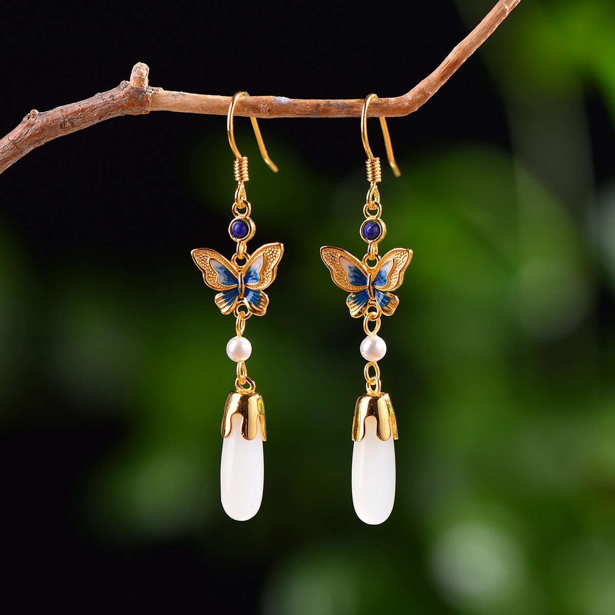 天然和田玉白玉925银镶嵌珐琅彩色蝴蝶水滴玉石耳环耳坠耳饰