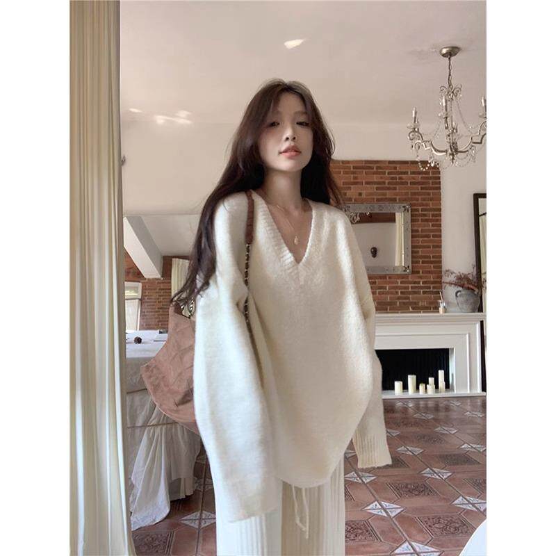 奶白色温柔风v领套头毛衣女秋冬慵懒风宽松软糯针织衫高级感上衣