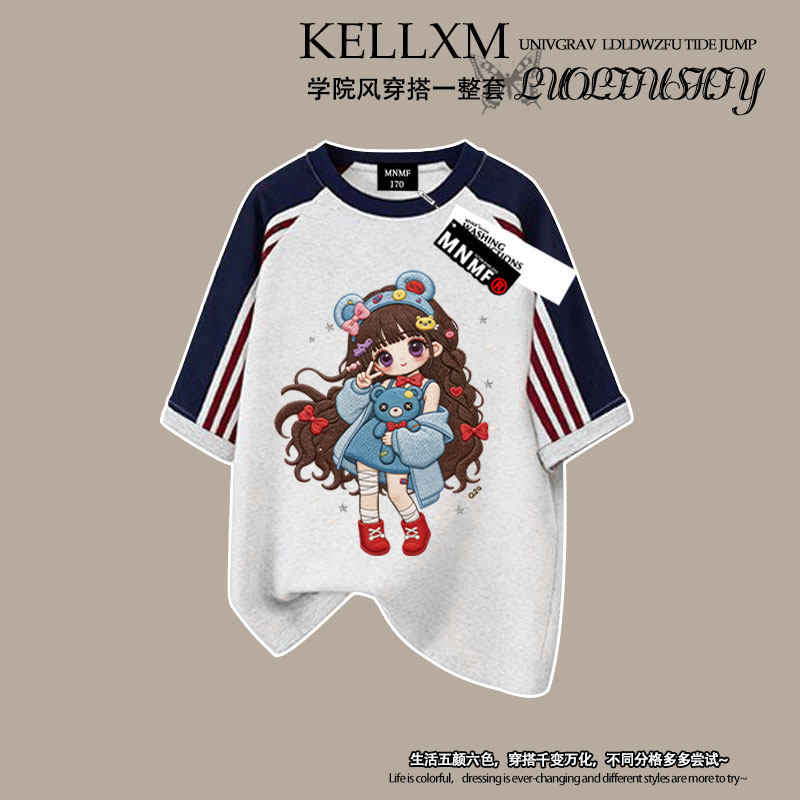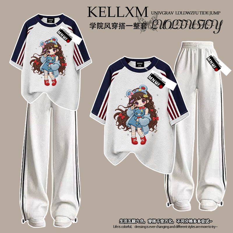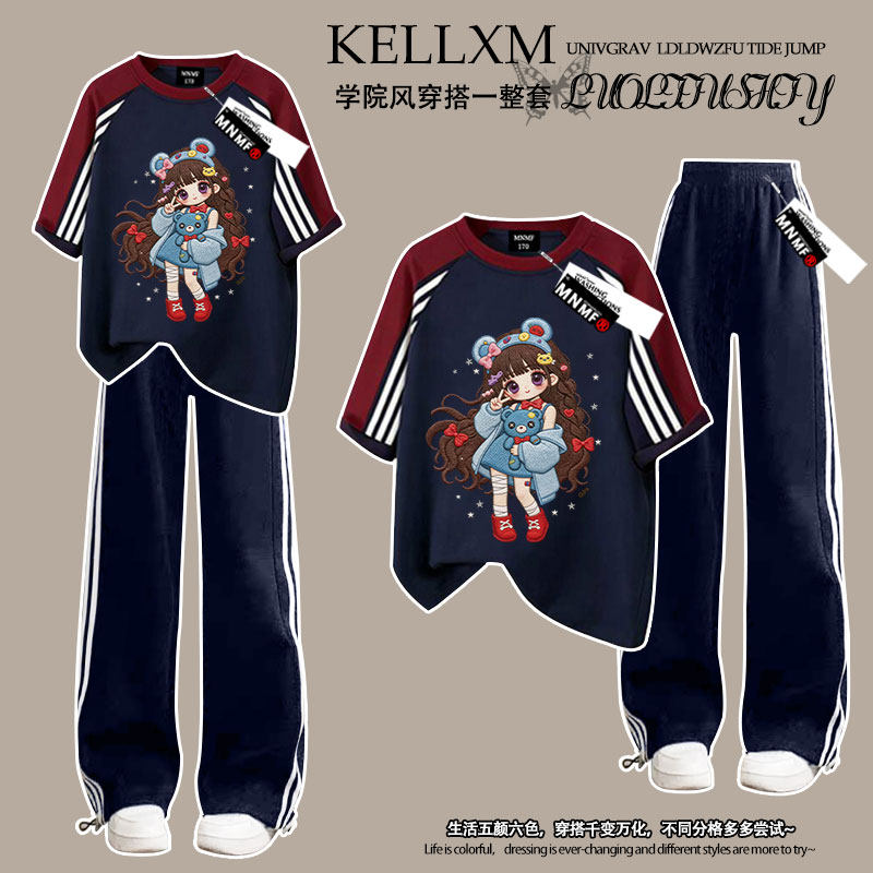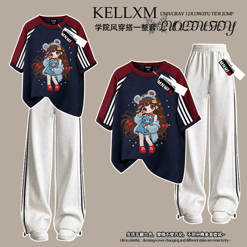 洋气女孩仿刺绣女童2026夏季女童插肩三条杠短袖t恤长裤套装学生