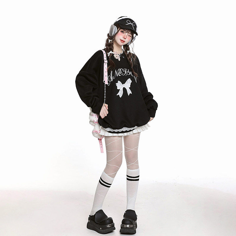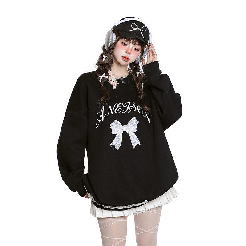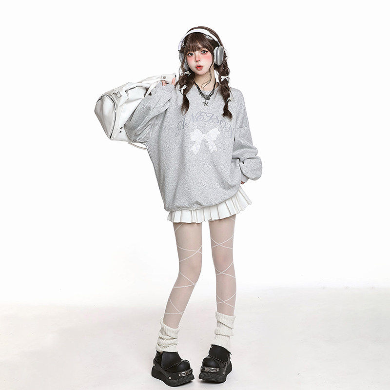 灰色蝴蝶结刺绣圆领厚棉T女春季新款2025无帽韩系休闲 宽松长袖上