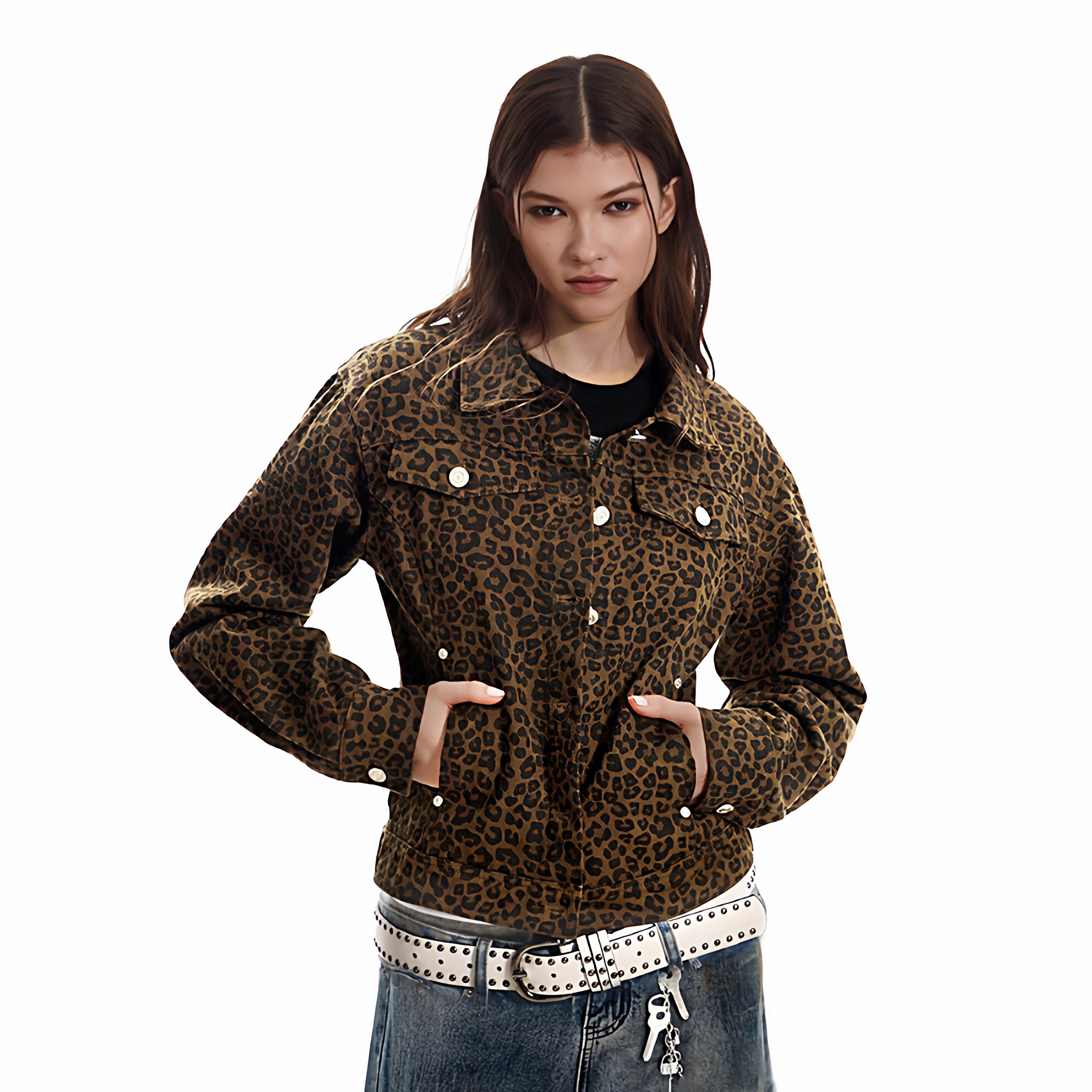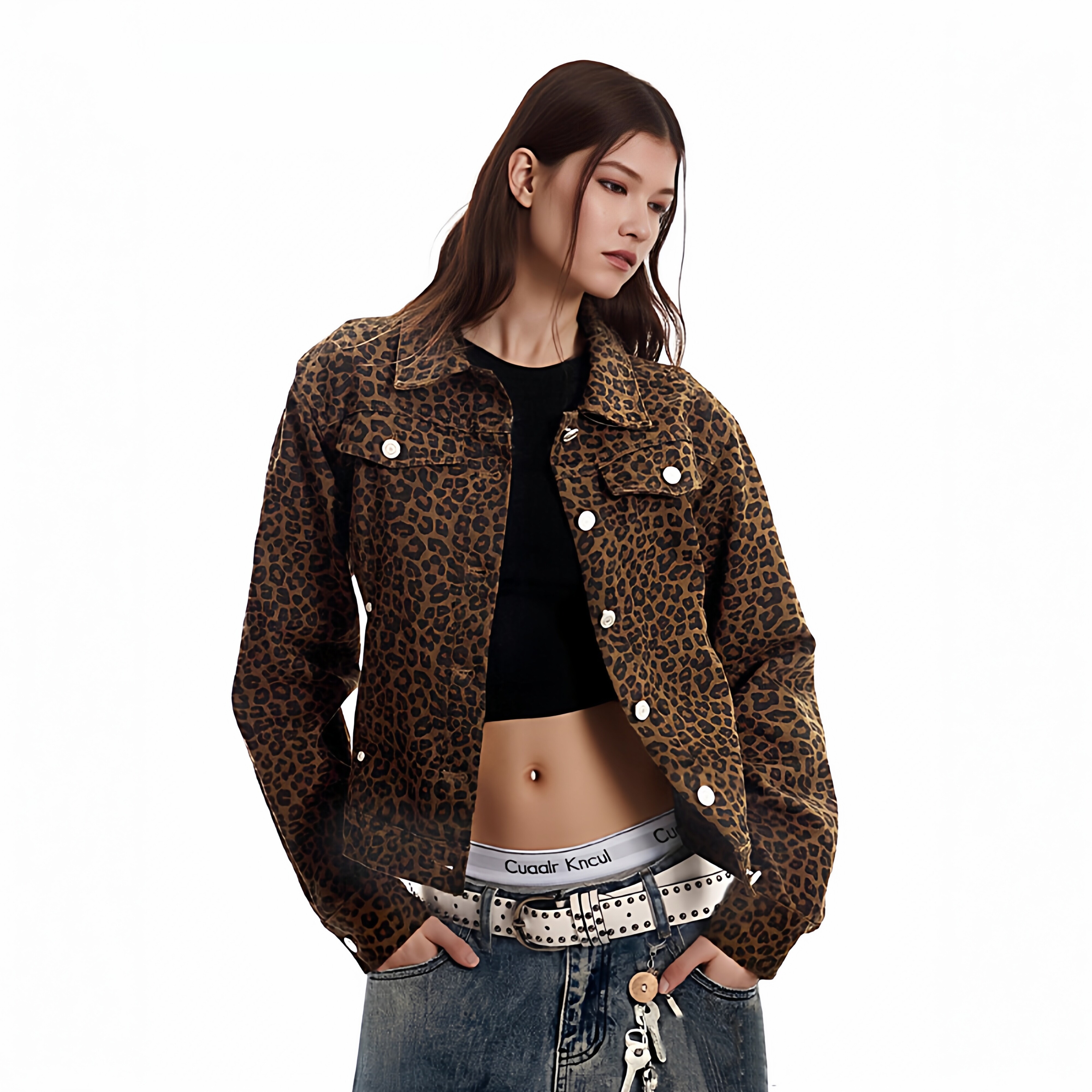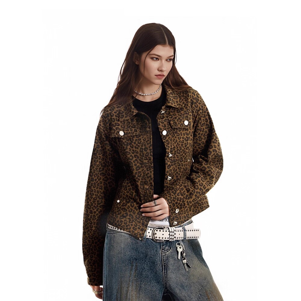 【RST】复古翻领豹纹短夹克美式外套女修身显瘦小众设计感上衣