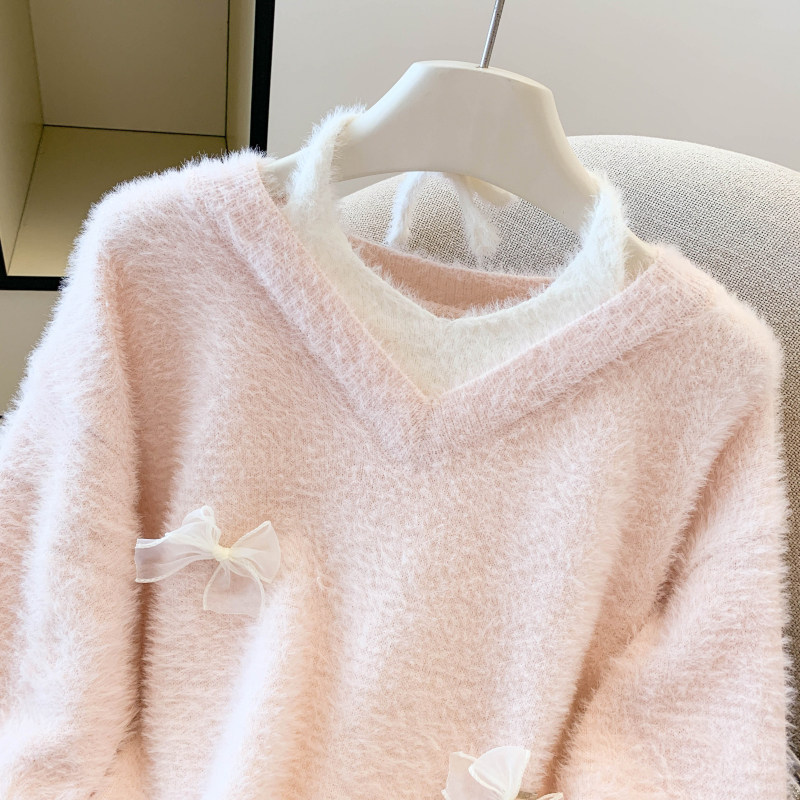实拍 假两件蝴蝶结V领粉色针织衫女秋冬水貂绒毛衣中长款上衣