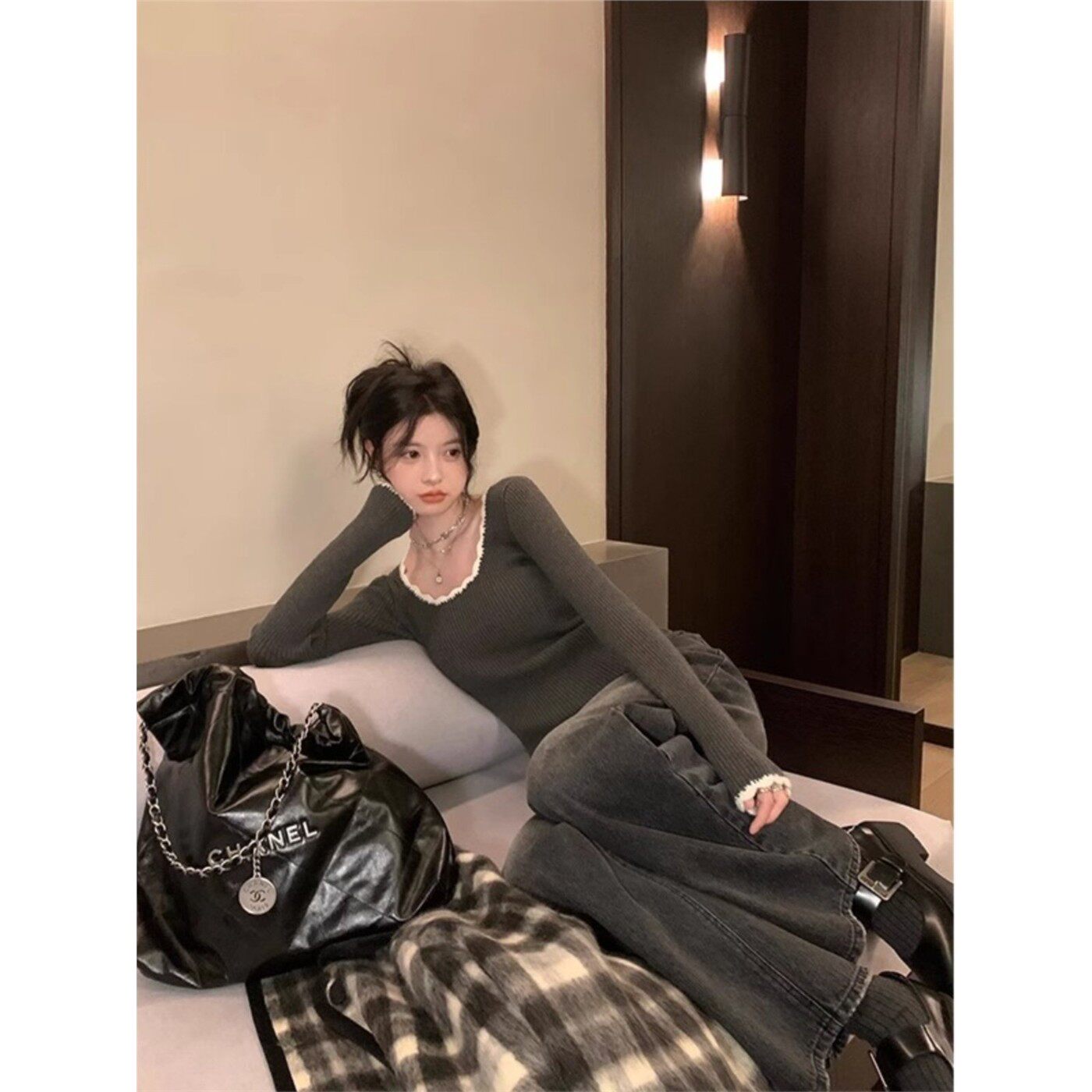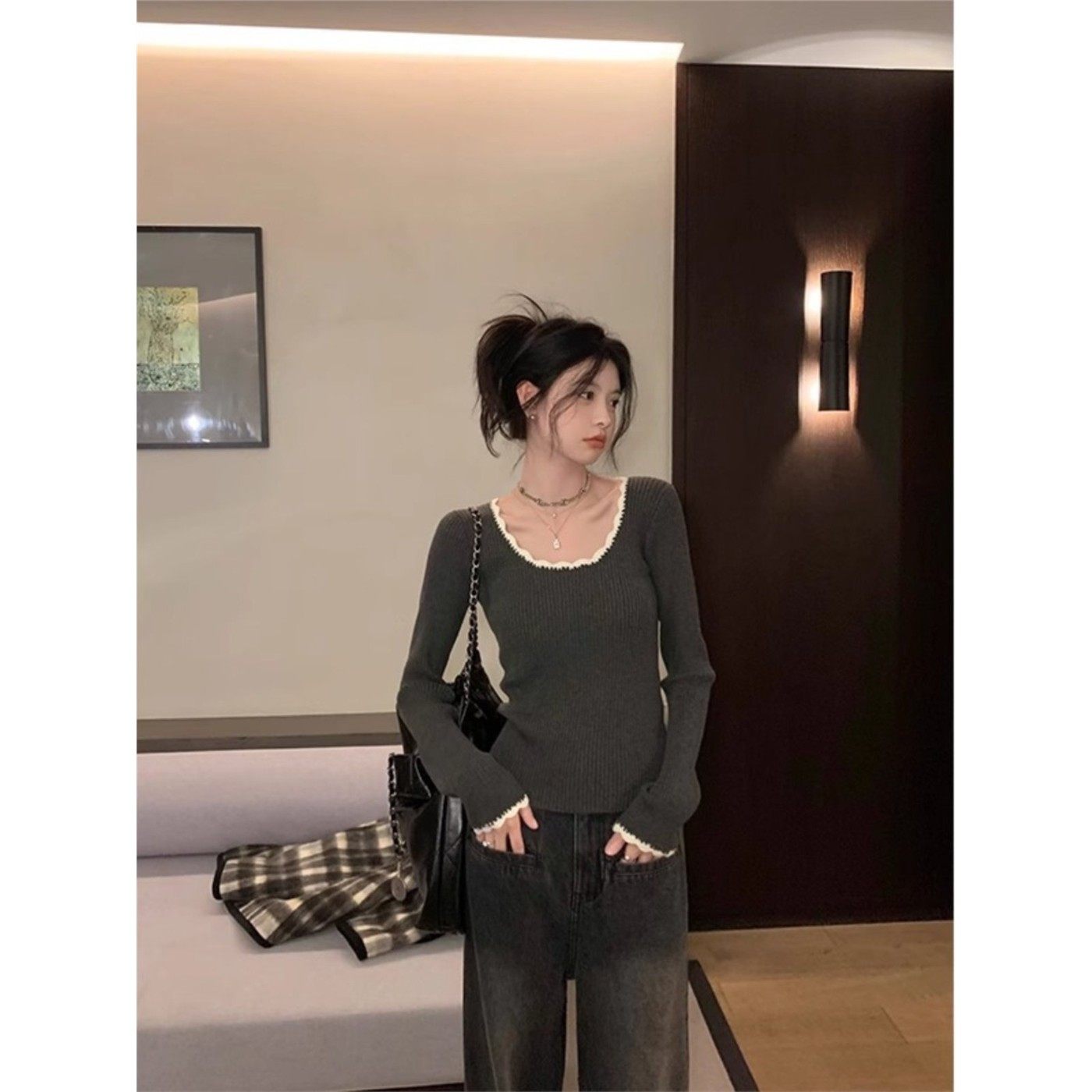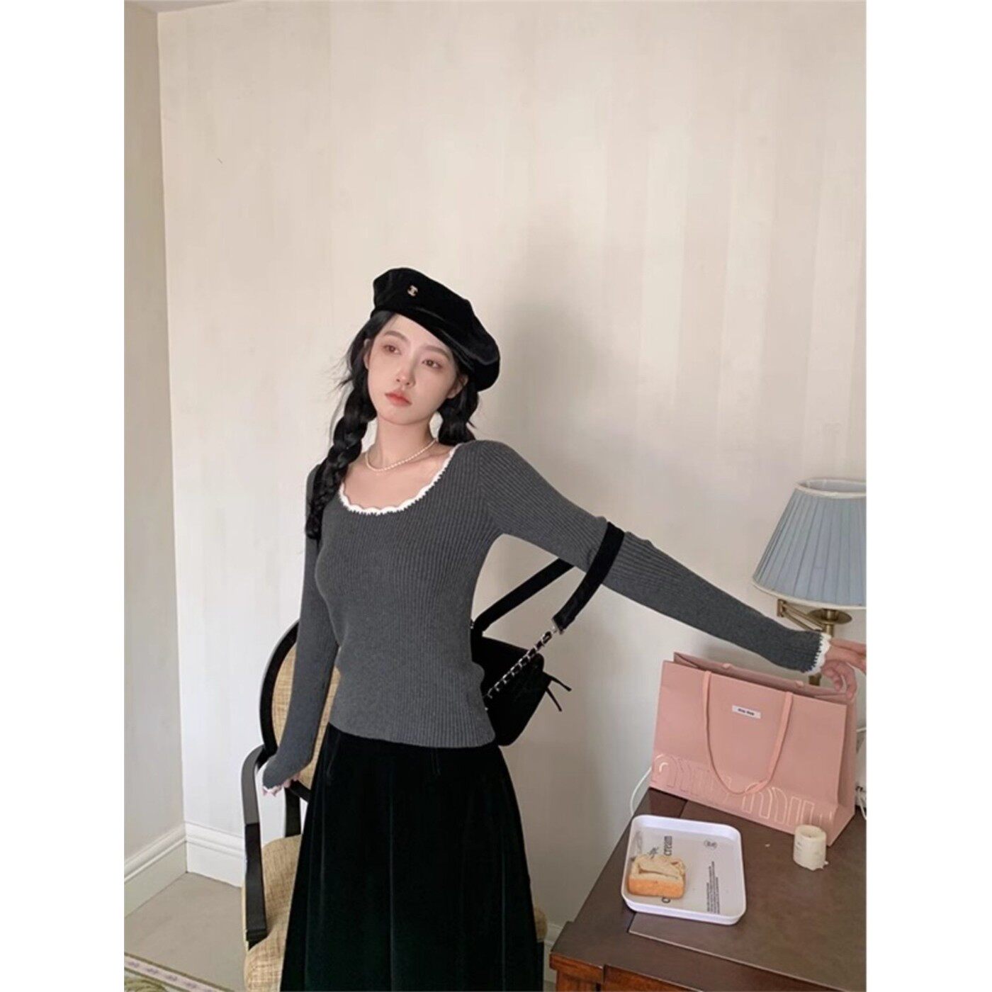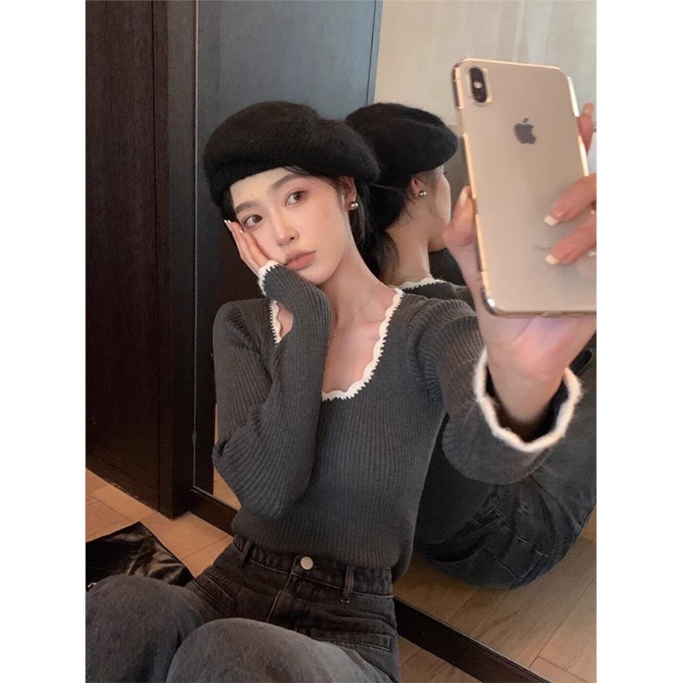 撞色花边miu系针织衫秋冬修身方领高级感打底毛衣女时髦内搭上衣