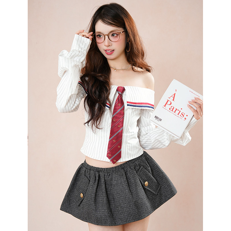 【首尔艺术生】 一字肩美式长袖条纹衬衫女秋气质低腰裙裤两件套