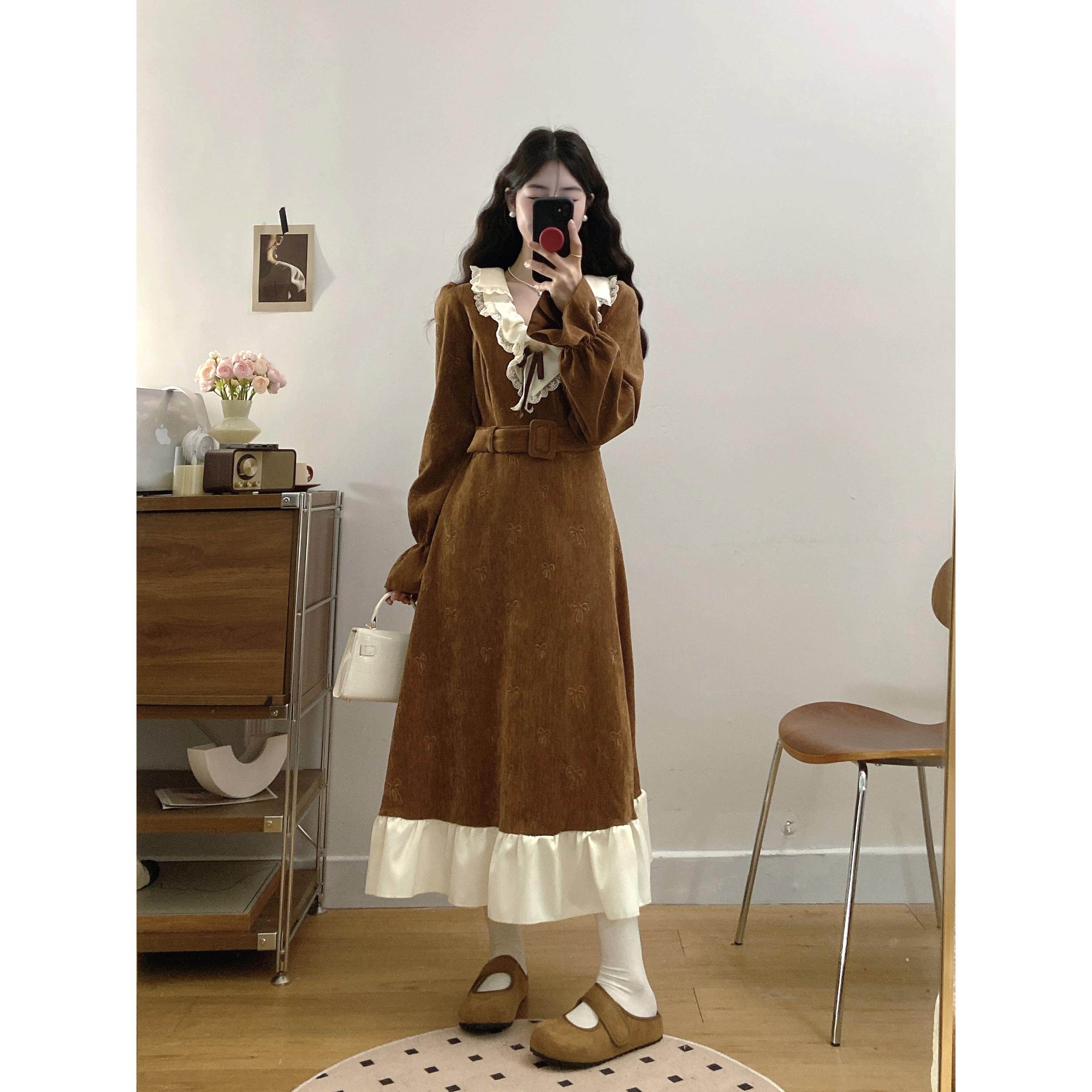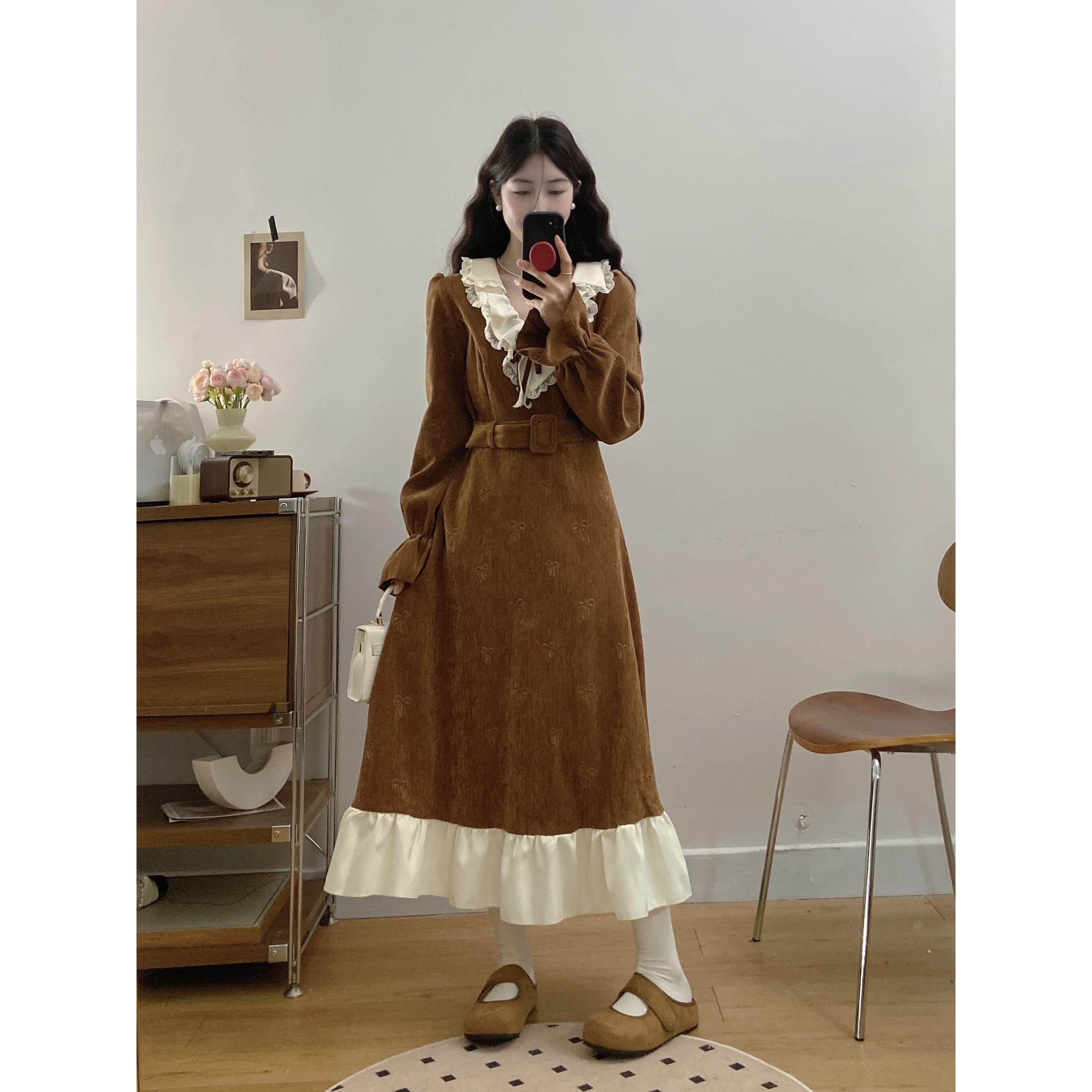 大码女装复古雪尼尔拼接长裙2025秋冬新款设计感连衣裙