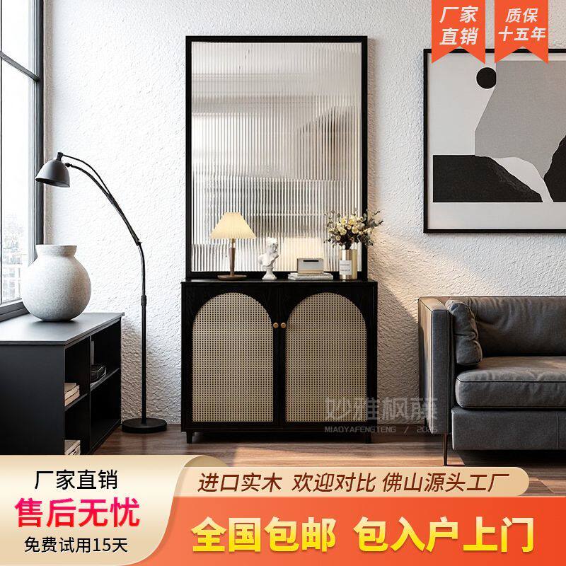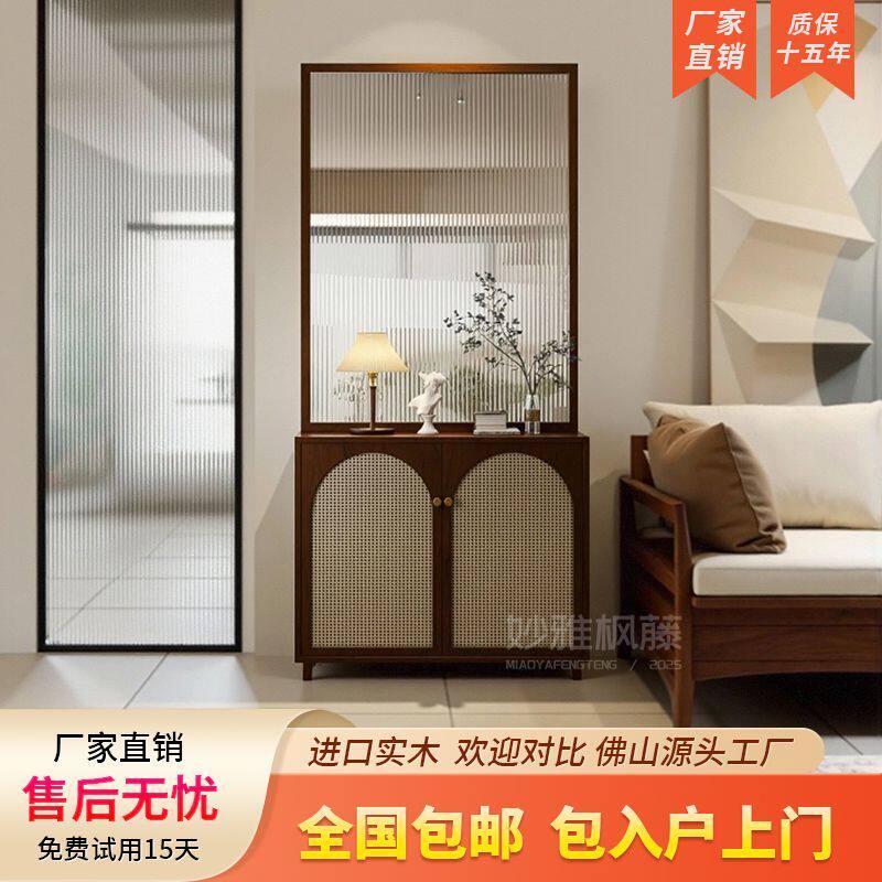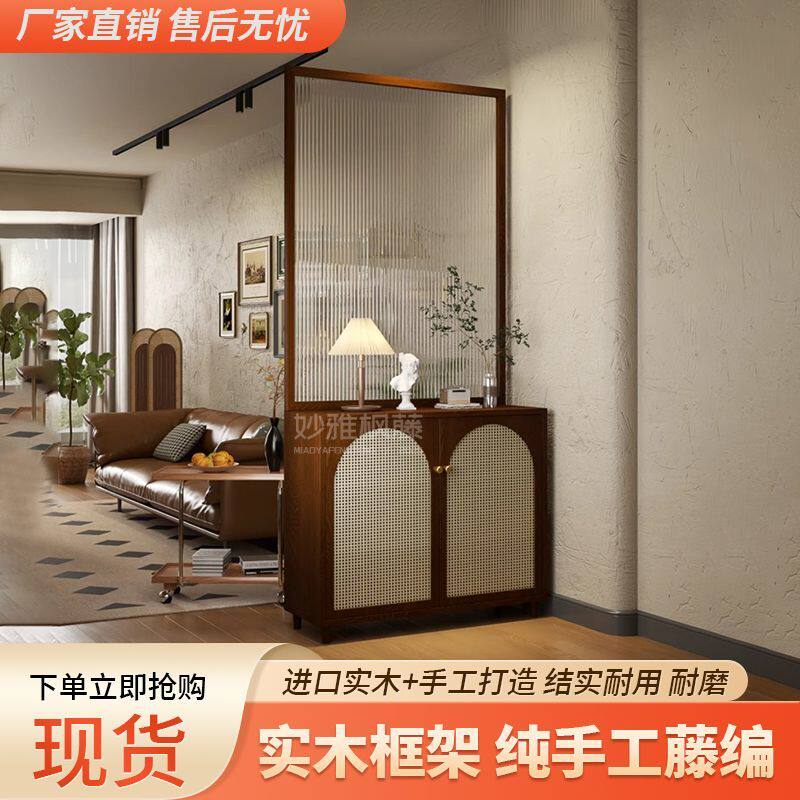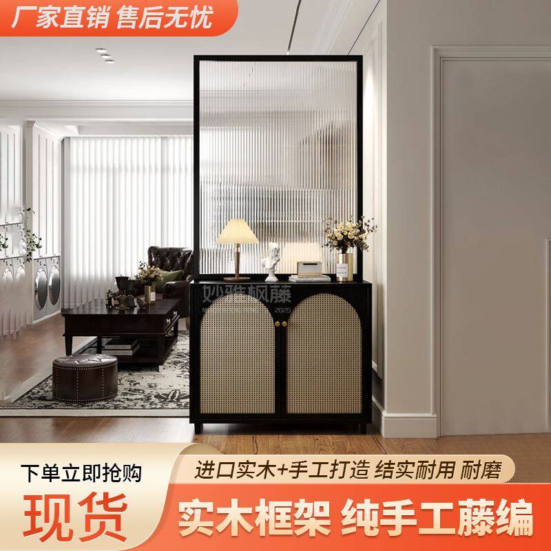 法式玻璃屏风隔断客厅实木入户正对门鞋柜玄关柜藤编家用遮挡座屏