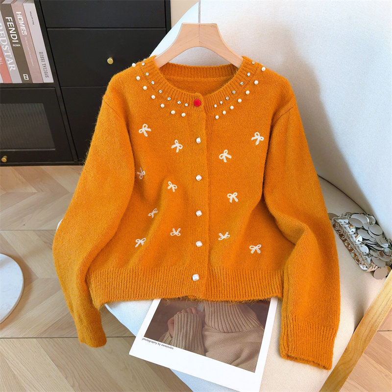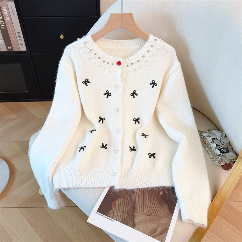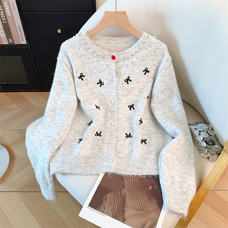包邮包邮甜美风钉珠蝴蝶结设计针织衫女秋冬新款洋气减龄百搭显瘦