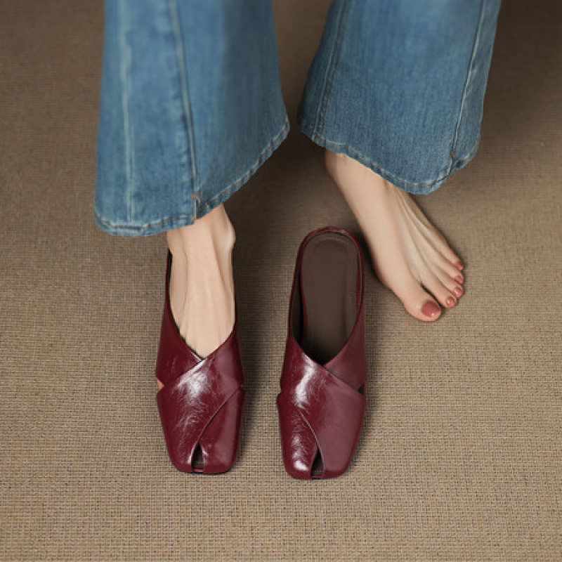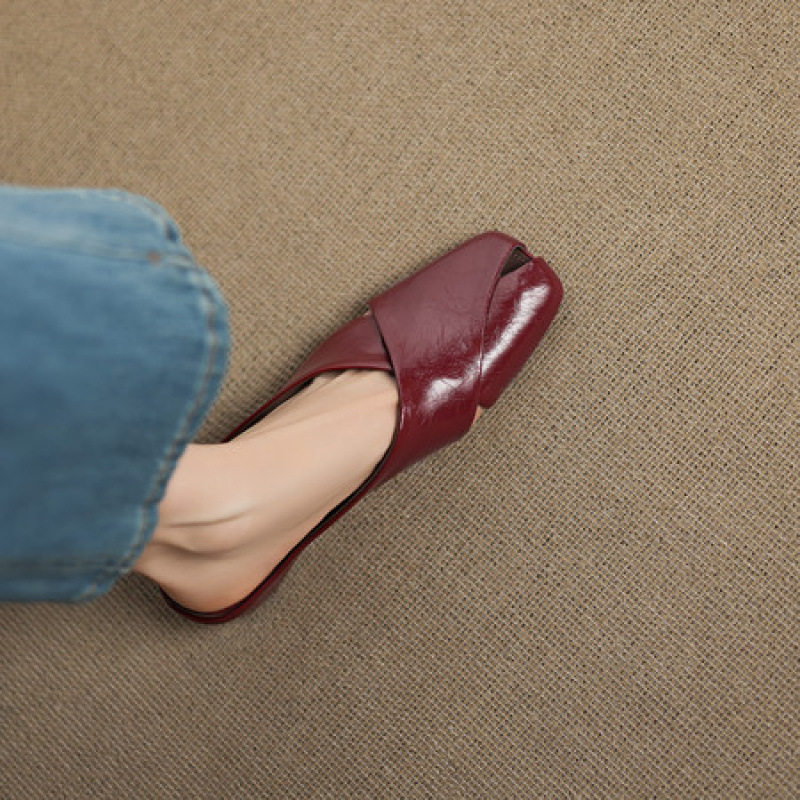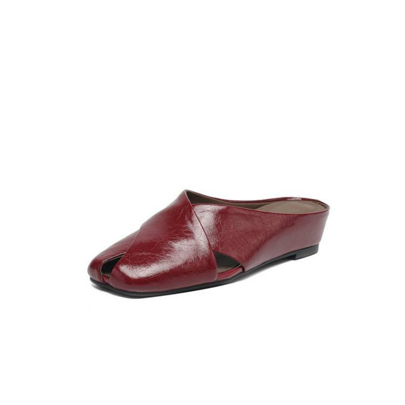 巨好看不累脚凉拖女夏外穿镂空包头半拖鞋内增高真皮穆勒鞋酒红色