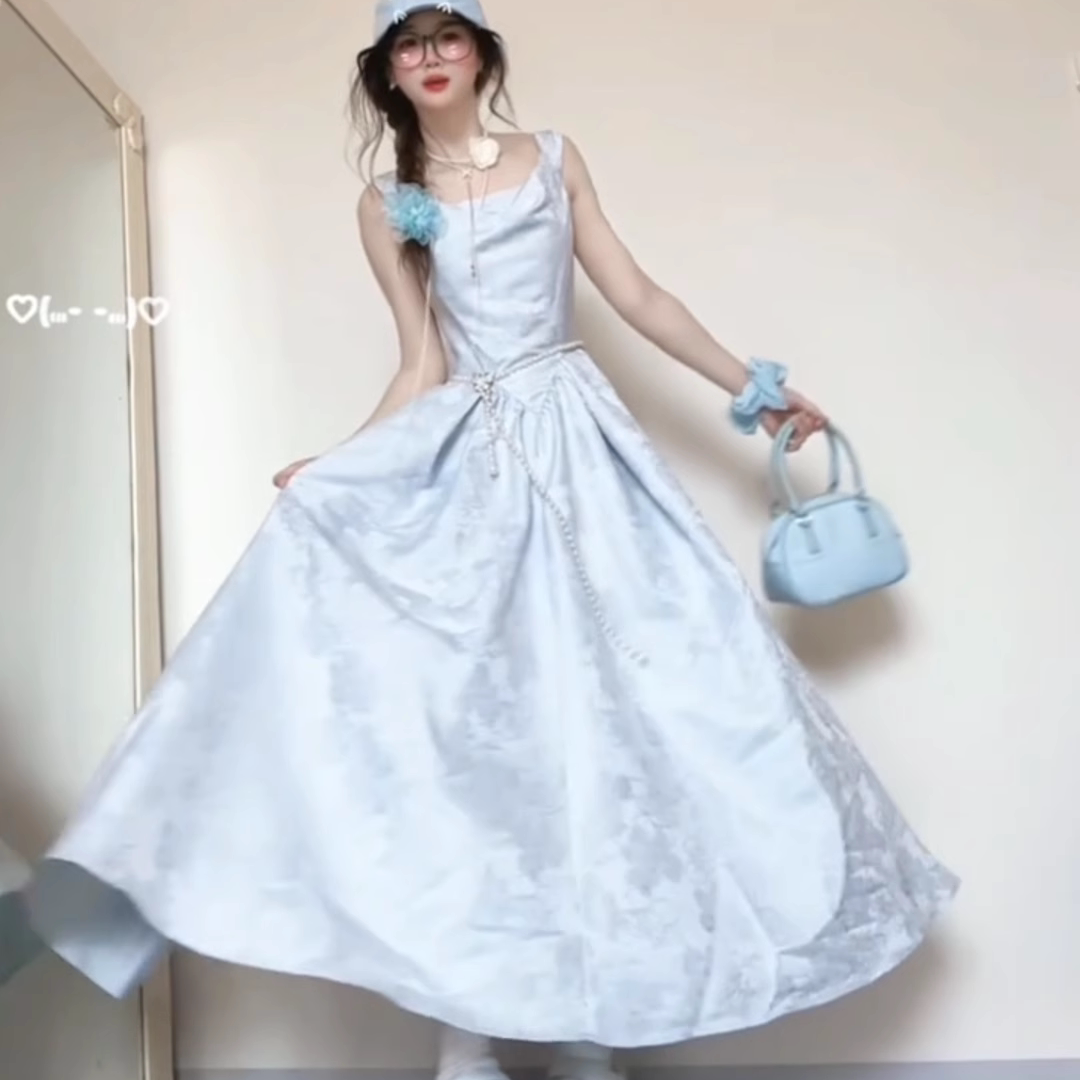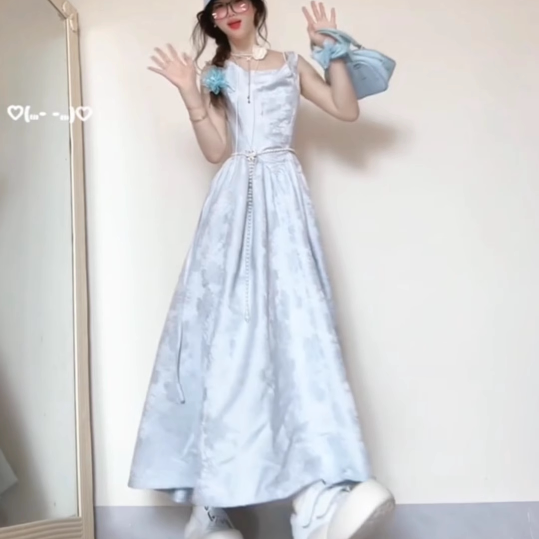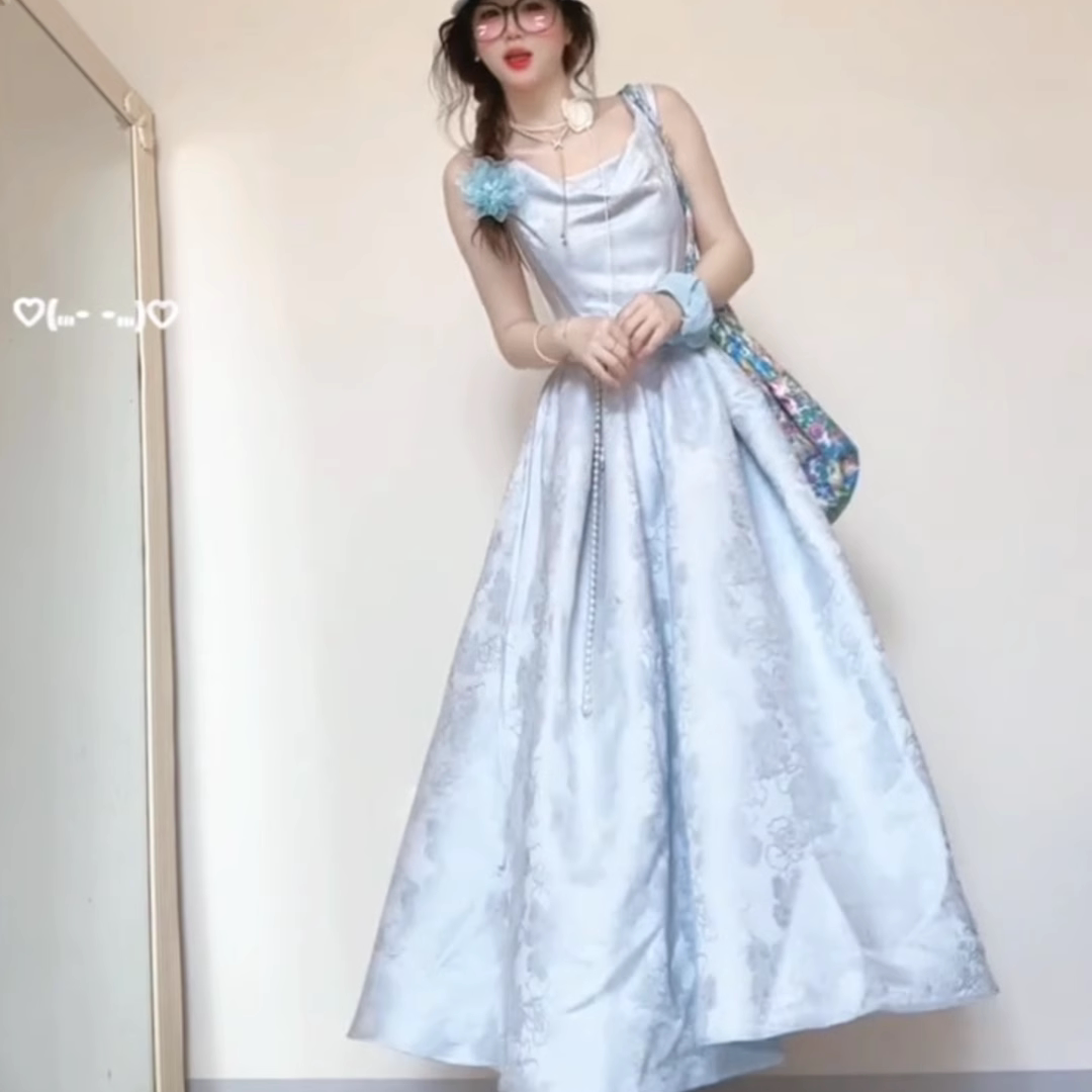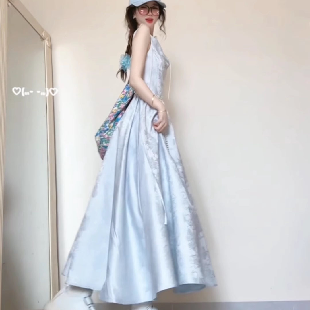 波可曼之旅 法式复古收腰显瘦荡领蓝色提花吊带连衣裙绝美长裙夏