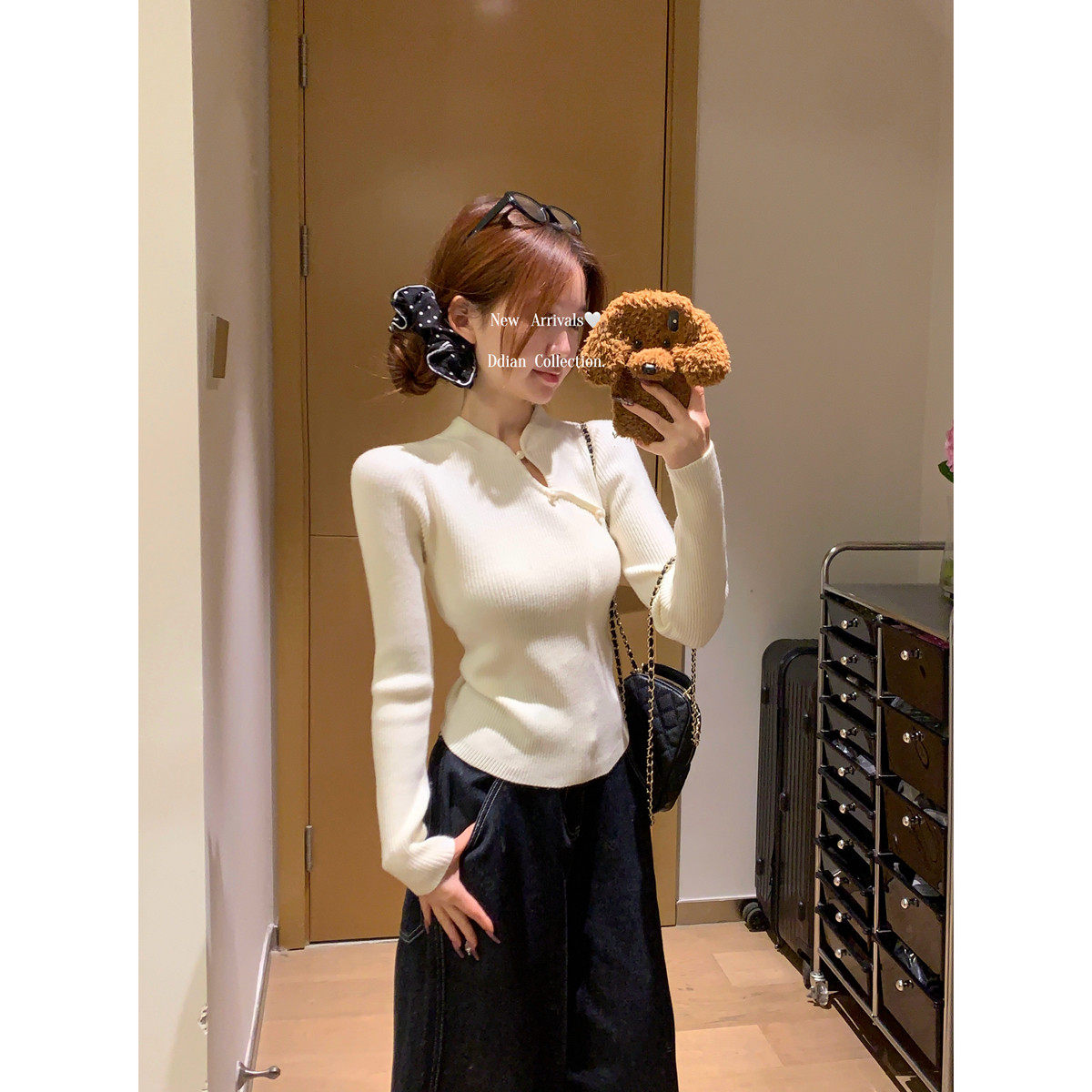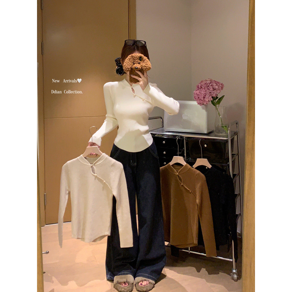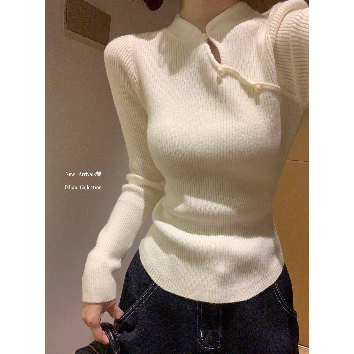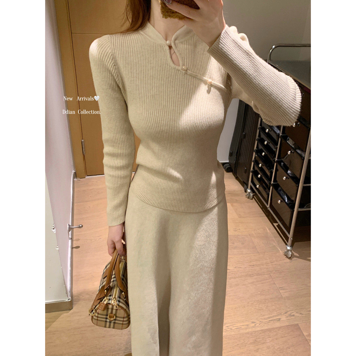 早春季新国风修身斜扣打底衫女皮草内搭毛衣高级感燕麦色针织上衣