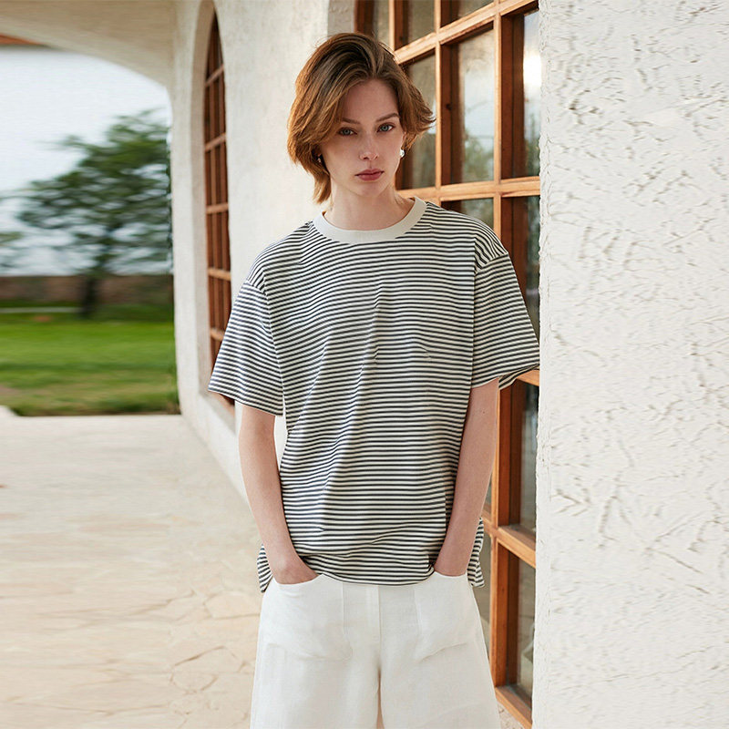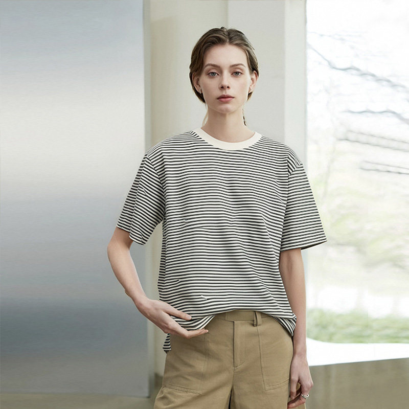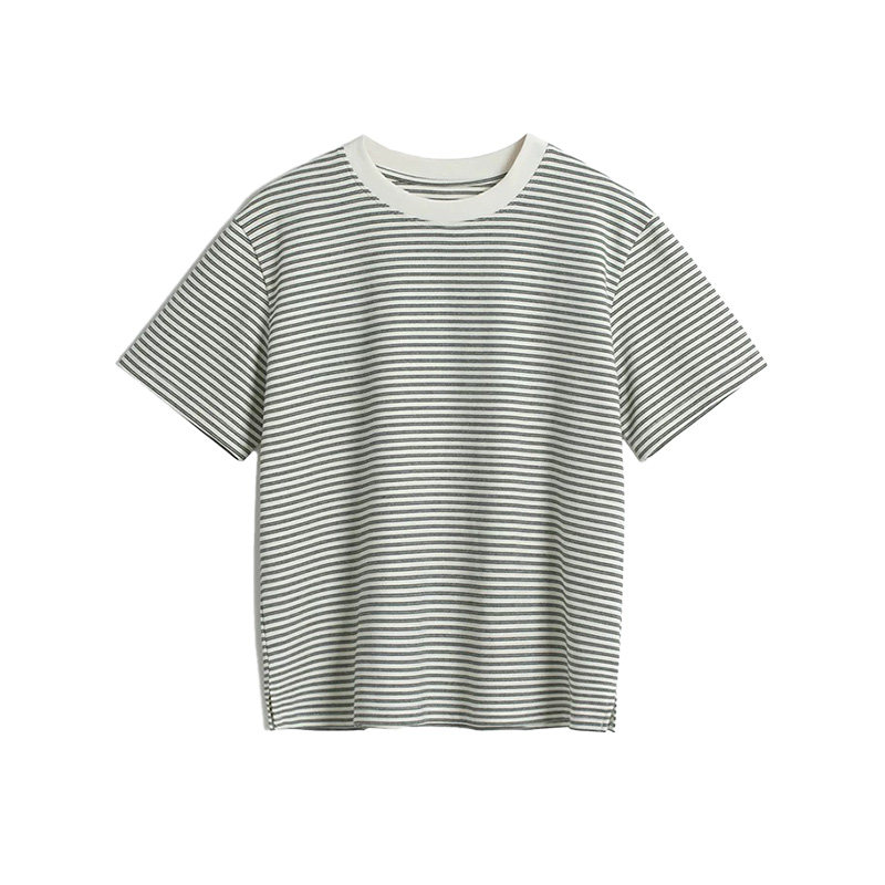 秋季新款圆领条纹短袖T恤女宽松显瘦百搭休闲上衣MXESS1695