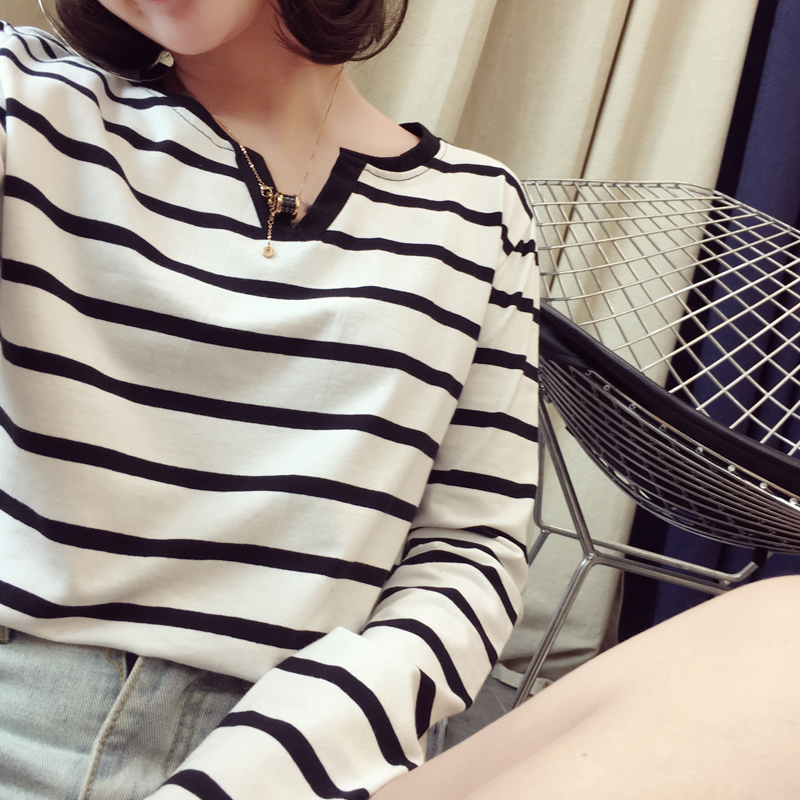 春秋季新款女装体恤性感V领条纹长袖修身打底衫T恤学生装精品潮流