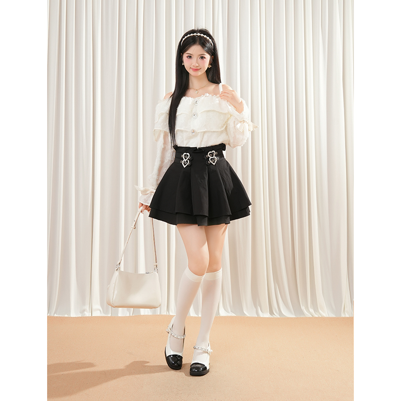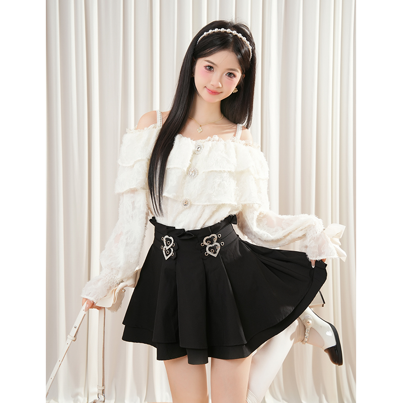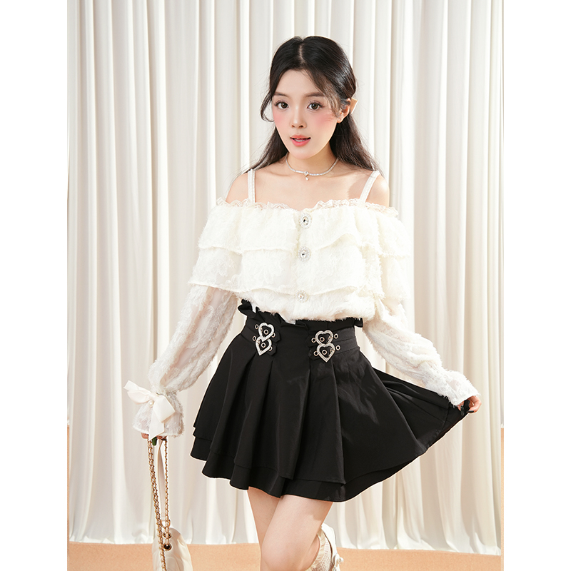 【温柔限定】日系长袖清楚系蕾丝衬衫+黑色高腰短裙两件套女秋季