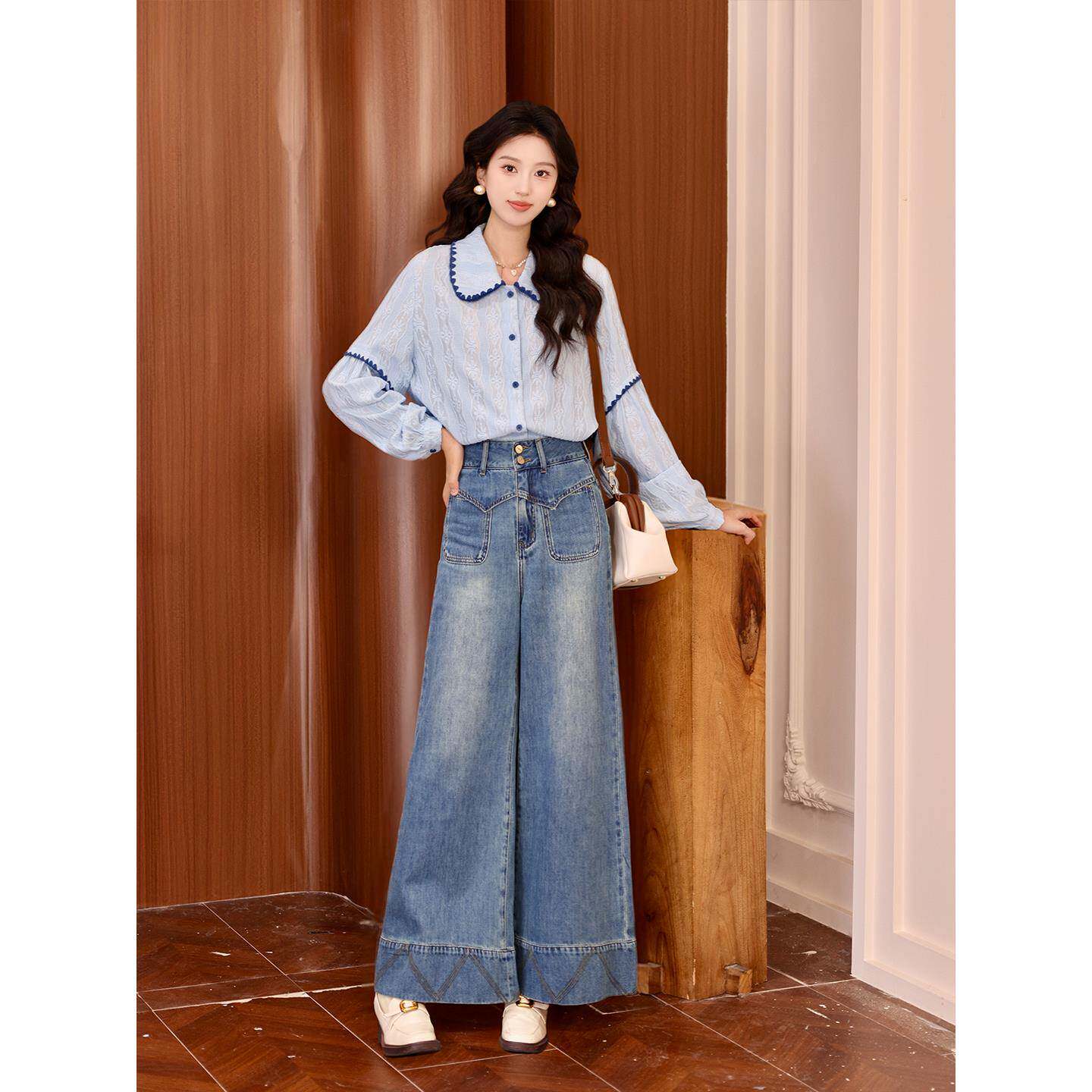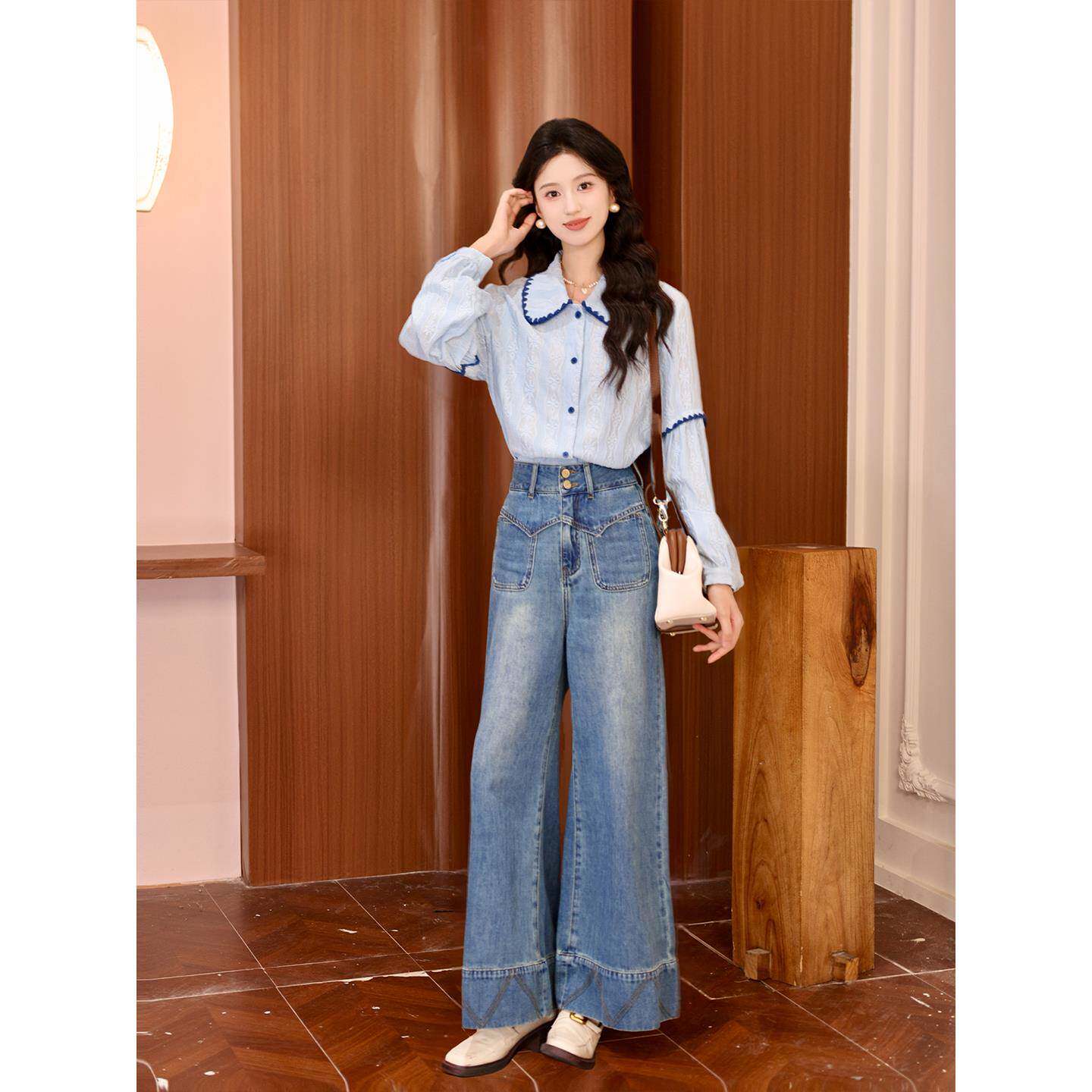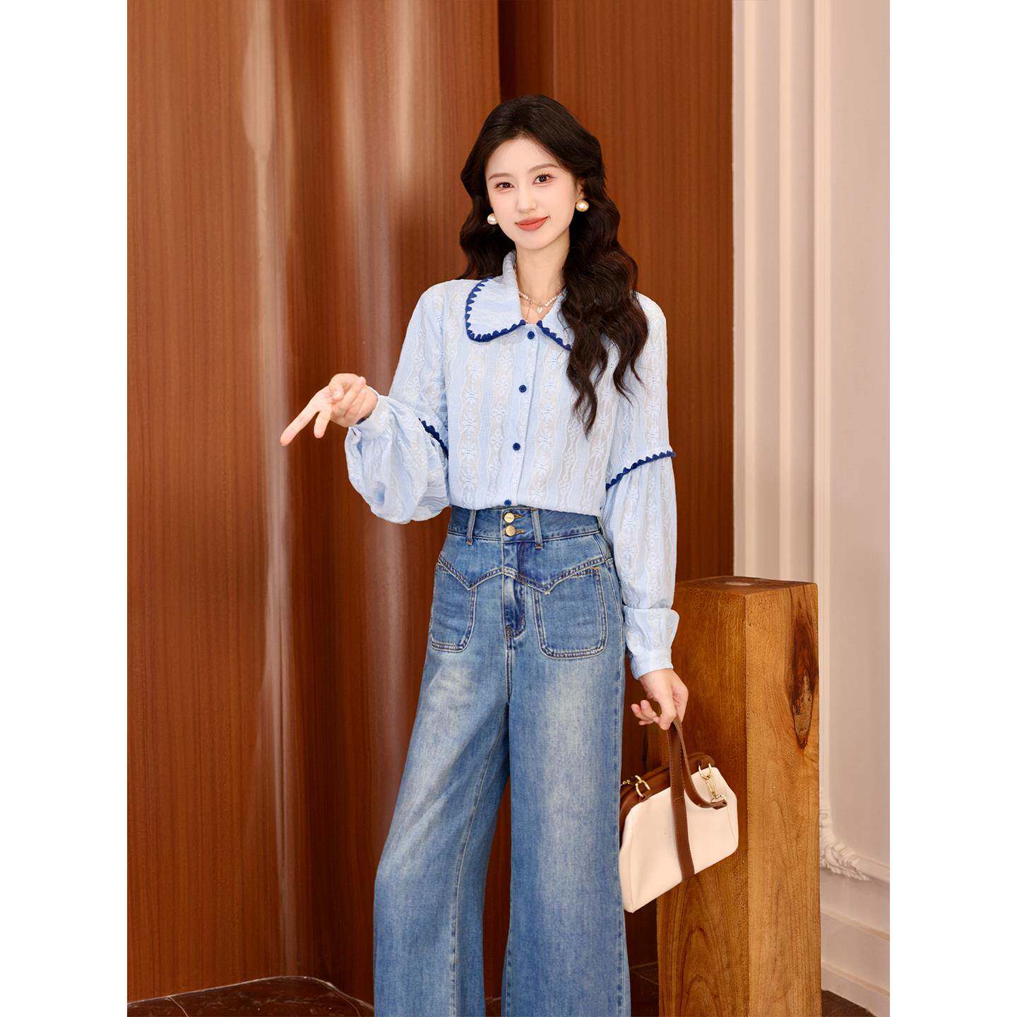 琦琦【蓝色诗篇】蓝色刺绣长袖衬衫女秋季新款提花设计感别致上衣