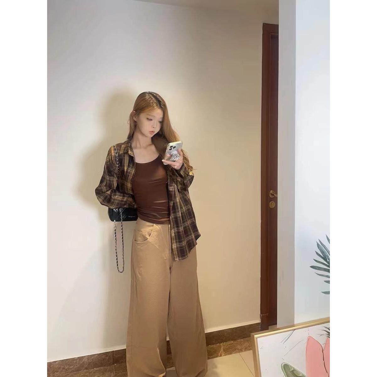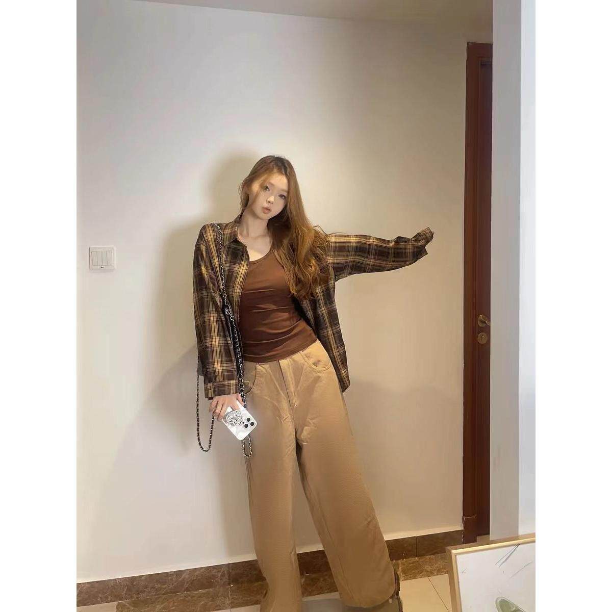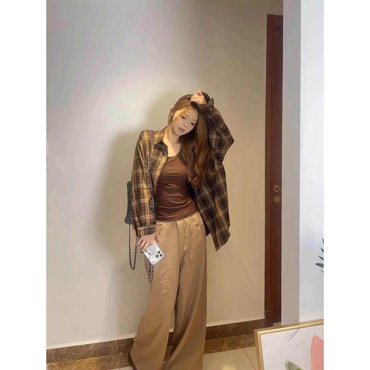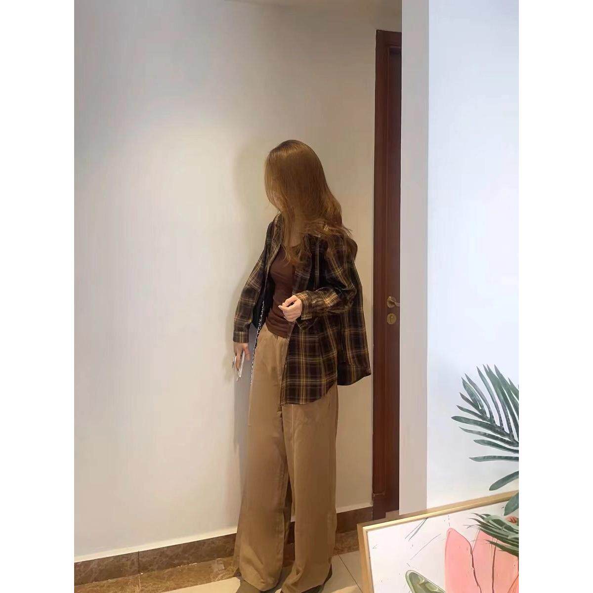 韩式覆古长袖格子衬衫外套女春秋季设计感小众宽松百搭翻领衬衣潮