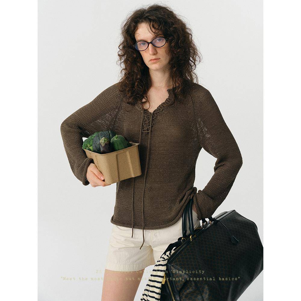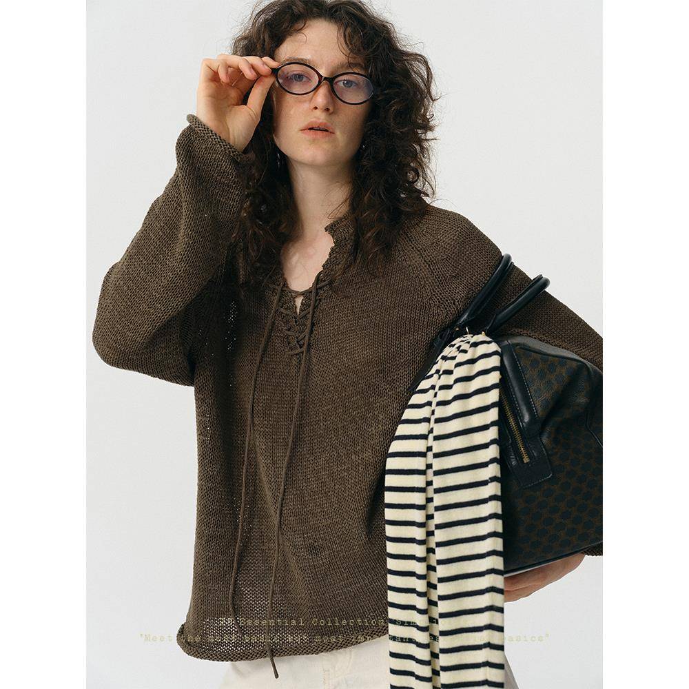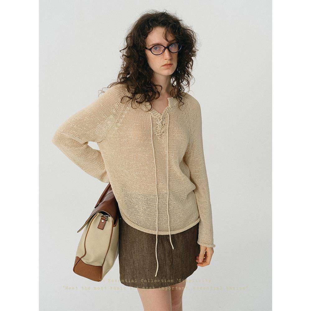 谁桃子纯色镂空绑带长袖针织衫女新款宽松显瘦上衣罗马绑带套头衫